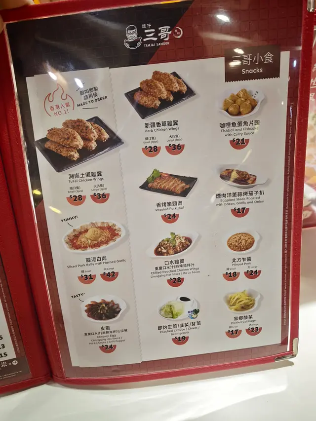好耐冇幫襯譚仔三哥,今次聽聞佢哋出咗新套餐,即刻拉埋老公沖過去試!入到鋪頭,紅黑招牌同熱鬧嘅人氣依舊熟悉,坐低睇menu時,新套餐款式幾吸引,但始終抵不過「過橋薯粉」嘅誘惑,最終揀咗心心念念嘅沙沙湯底。 個沙沙湯底真係驚喜!一上桌就聞到陣南洋椰香混合香料嘅味道,酸酸辣辣好開胃,撈埋爽滑彈牙嘅薯粉,每條粉都吸滿湯汁,入口層次好豐富。而且過橋薯粉本身配料好足,鮮嫩肉片、爽口豆芽、滑溜豆腐皮樣樣有,根本唔使額外加餸,一碗落肚已經好飽足。仲附埋一份炸醬,倒落薯粉度拌勻,鹹香惹味,又多咗種口感,正! 小食方面,我哋點咗「湖南土匪雞翼」同「口水豬耳」。土匪雞翼烤得外皮金黃酥脆,入面嘅肉嫩到出汁,灑上芝麻同香料超級香,咬落香辣味衝上腦,老公食到停唔到口;口水豬耳就爽脆過癮,麻辣鮮香夠晒入味,送粉一流。最抵赞係店員仲送咗份「香烤豬頸肉」,肉質軟嫩帶點焦香,油脂分佈均勻,冇得彈! 飲品揀咗凍鴛鴦,咖啡嘅醇厚同奶茶嘅絲滑融合得好好,甜度岩岩好,飲落去中和咗食物嘅辣味,解渴又解膩。 今次探店真係滿分體驗!雖然新套餐吸引,但經典嘅沙沙湯薯粉同小食一樣唔會令人失望,價錢又親民,性價比超高。鍾意酸辣風味嘅朋友,一定要過嚟試下,包你食到舔舔脷!…查看更多