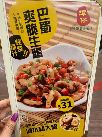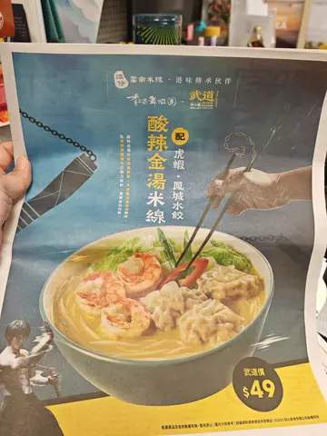 见报纸广告谭仔出左新产品 ~ 酸辣金汤米线,汤底是以黄灯笼辣椒、南瓜蓉及鸡骨汤制成。配菜指定为虎虾及凤城水饺,便相约同事一道去试新野。选了小辣味道,差不多十分钟就送到。汤碗是特制面碗,跟平时用的不一样,较高身,有一条芦笋及红椒片作点缀装饰,汤料有娃娃菜作配菜,跟平时的芽菜、腐皮、韭菜都不一样。(同事不吃韭菜才夹过黎😂)金汤比预期想像中清爽,酸辣平衡恰到好处,也很开胃,但就喝不出有南瓜味道,虎虾就是一个弹牙,虾味普通;反而凤城水饺有惊喜。虎虾跟水饺都是每样3件。这个汤底有惊喜,希望可以列入为做恒常餐单,做期间限定会觉得太可惜。…查看更多