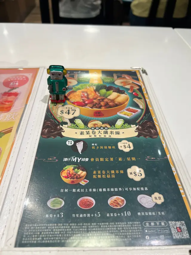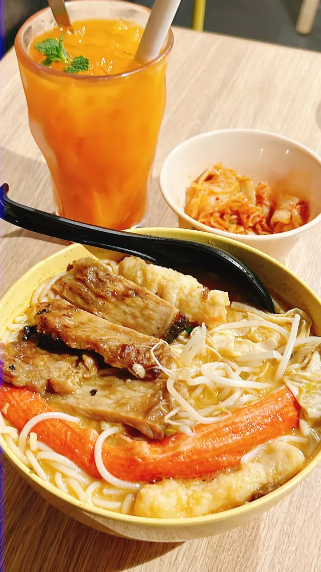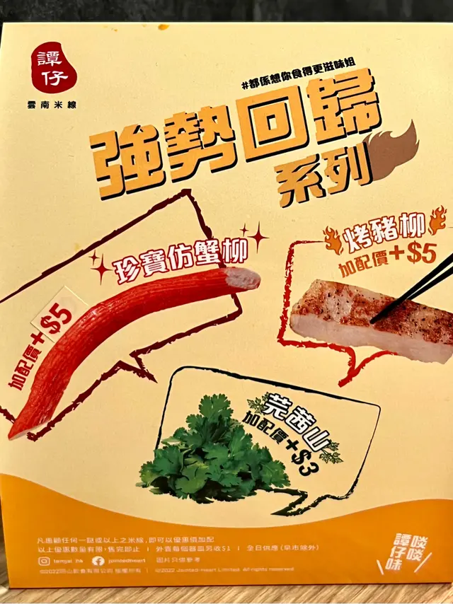 又來到我最愛嘅譚仔雲南米線,佢哋啱啱做緊promotion,叫一碗米線加一份配料,就可以加$5換到珍寶蟹棒另外亦可以加$5換埋烤豬柳,咁我就嗌左必食嘅墨魚春卷配埋呢兩款配料,之後姐姐同我講如果叫咗三款配料仲有泡菜送添!墨魚春卷珍寶蟹柳配豬樓麻辣中辣米線( $45 )條長蟹柳配上四件豬柳加埋只需要$10真係好抵,加上中辣嘅米線味道好夾食到好滿足!菠蘿野菜汁特飲( $14 )呢杯野菜汁係用上日本有名嘅野菜汁加上唔少嘅菠蘿蓉,出奇地好味有菠蘿嘅甜再加上蔬菜汁解辣一流,開頭仲諗住d蔬菜汁會好腥味點知原來好好飲!查看更多
