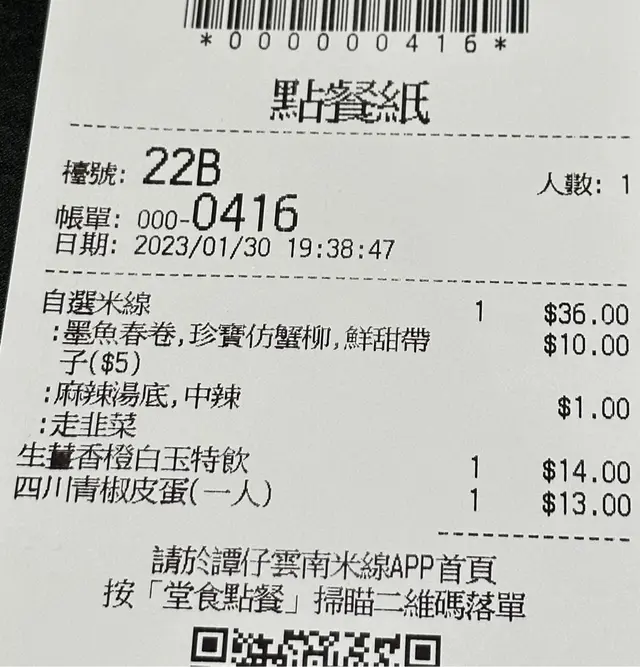 跟同事某日的平常午餐,來到平常不過的譚仔。同事的清湯原來都有分甚麼小辣的,他就叫了三小辣。湯底都幾順滑,配料亦對得上,況且上得快,過得去。愛刺激的小人當然叫了大辣!未到最高是因為怕回到辦公室太眼瞓!豬肉和墨魚春卷都不少,性價比是正路的,但貨色必定地是一般。豬肉完全無肉味,墨魚春卷有骨要吐。這客土匪雞翼,鹹到飛起,聽同事說原來譚仔間間水準不同……要浸一浸湯方可入口,差矣。還需一提的是現場以二維碼落單,小人及同事掃完之後都要在手機安裝,我們都不願意,決定叫店員解決。同枱大部份食客都要做同樣的動作,到底二維碼落單是不是這麼的輕鬆呢?查看更多