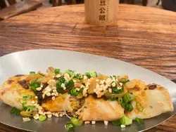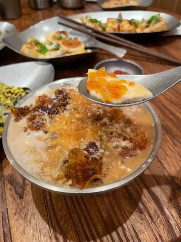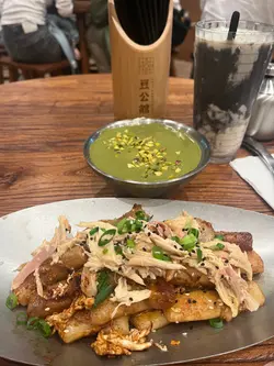 豆公馆位于美食小店林立嘅旺角广华街,豆公馆顾名思义就系豆品项目为主嘅一间地道小店。餐厅采取以QR code自助下单够哂方便👍🏻我哋两个人就叫咗几款招牌品一齐share,最重要嘅就梗系试吓呢度嘅驰名招牌开心果豆腐花❤️差唔多系每一台必点嘅甜品之一😍😍招牌麻婆腐皮蛋饼系必试!蛋饼煎到金黄微焦,蛋饼入边系满满嘅馅料,免头放咗招牌麻婆酱同埋少量榨菜,每一啖都系多重口感,整体辣度中等👍🏻老干妈炒米粉够干身亦唔算油,虽然米粉较碎身但完全唔影响整体味道,老干妈嘅豆豉香同辣味相当惹味,唔好睇佢好似细细碟,但系份量相当足料,建议两个女仔可以点小份,咁就可以再试吓其他嘢食🤭🤭一口鱼肉煎豆腐就好似旧式煎酿三宝咁😆😆但系佢嘅鱼肉同豆腐系分开嘅,鱼肉饼外皮煎香,豆腐软滑,鱼肉馅鲜甜,蘸埋秘制酱汁都几够味,一客4件作为小食💯💯鸡丝铁板蛋肠粉热辣辣上台,肠粉每条都炒至金黄色,边边仲会带点焦香嘅脆脆口感,整体系香到停唔到口,手撕鸡丝配上肠粉相当唔错,重点系竟然有唔辣嘅选择,如果食辣嘅朋友就更加推介选择麻辣鸡丝口味🤗🤗开心果豆腐花净系卖相已经相当吸引😍成碗都系开心果嘅绿色🥰🥰豆腐花嘅豆味浓得来滑到不得了,加上浓郁嘅开心果酱,甜中带点点坚果香,难怪每一台都必点一份❤️除咗甜品选项之外,仲有好多多款豆类制品嘅饮品选项,例如有特色口味嘅豆浆、黑芝麻豆浆、桂圆桃胶豆浆等等,而我哋就拣左孖宝系列嘅黑芝麻丸子孖宝同黑糖珍珠孖宝😚😚孖宝系列其实就系豆腐花,加上豆浆,咁你就可以一次过试晒两款豆制品😚😚芝麻丸子口味嘅芝麻酱香到爆灯,加试或信嘅豆腐花同埋烟烟韧嘅白玉;而黑糖珍珠QQ又有嚼劲,黑糖味浓但唔会太甜👍🏻👍🏻…查看更多