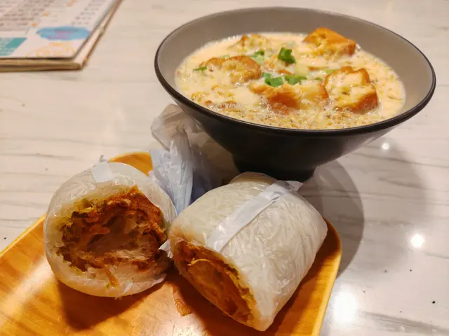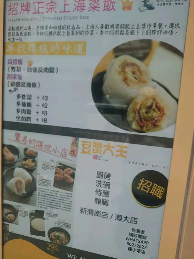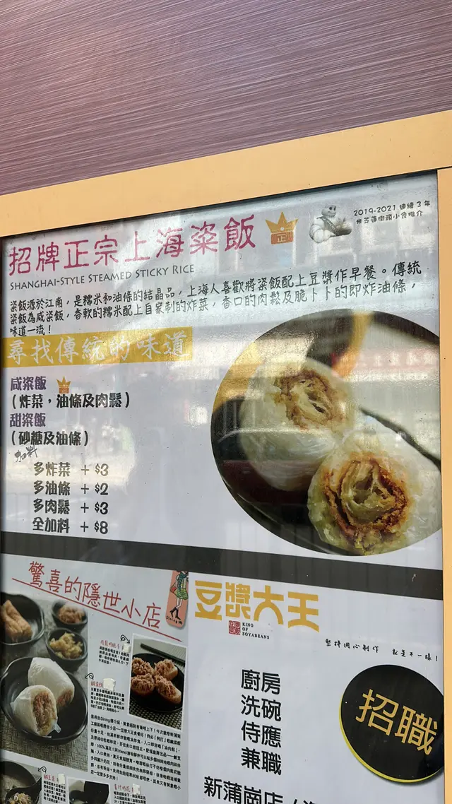 今日喺新蒲崗嘅豆漿大王試咗佢哋嘅招牌粢飯同鹹豆漿,真是一個驚喜嘅早餐體驗!店舖環境簡單樸實,帶點懷舊風,店員好熱情,推介菜式時充滿熱誠,令我對食物充滿期待。首先試咗粢飯,糯米軟糯適中,包裹住油條、鹹菜同肉鬆,口感層次豐富。糯米飯外層微焦,咬落去香脆可口,油條仲保留到酥脆嘅口感,配搭肉鬆嘅鹹香同鹹菜嘅酸爽,味道和諧得令人滿足。份量十足,食完真是一個踏實嘅飽足感,適合早餐或午餐食用。鹹豆漿更加係亮點!豆漿入口順滑,帶有濃郁嘅豆香,鹹味恰到好處,配上蔥花、蝦米同油條碎,每一啖都充滿風味。豆漿微溫,唔會燙口,調味精準,酸鹹平衡,令人回味無窮。相比坊間其他鹹豆漿,呢度嘅版本真是一個新鮮嘅驚喜,感覺好似搵到傳統嘅味道。價錢方面非常親民,粢飯同鹹豆漿都係十幾蚊,性價比極高,絕對係平民美食嘅典範。唯一小缺點係店內座位唔多,等位可能要點耐心。但整體體驗真是一個大滿足,無論係味道定服務都令人開心。下次會再嚟試佢哋嘅甜豆漿同其他小食!總分:9/10,強烈推薦畀鍾意傳統台式早餐嘅朋友!…查看更多