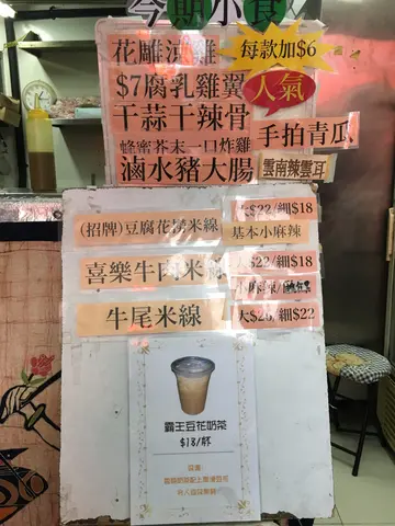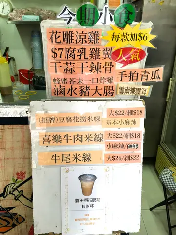 今日老公与朋友有约,我还在考虑是否留家煮一个人的公仔面时,突然想起食米线,荃湾的米线店虽然包罗万有,但未会像这间,为一碗米线而添上凉凉的豆花。去完黄金买portable hard disk, 过条马路就到这间店,非常方便,地理位置上亦吸引好多附近读书的学生哥,所以一到中午都有不少学生买外卖。店舖位处于钦州街及福荣街交界,招牌以浅蓝色为主,颜色鲜明。刚到时已约6点,落单前后分别有年青人光顾外卖,果然比较吸引年轻族群。本店有三种口味米线,除招牌豆花米线,亦有喜乐牛肉米线,及牛尾米线。"喜乐"意思竟然是用七喜及可乐而做的汁酱,未试过都知会偏甜,而牛尾米线当然会配上牛尾,再加红萝卜及西芹,由于今次是传统口味上瘾,唯有下次再试牛肉米线。今期见到有7款小食供应,5款肉类,2款素类,招牌的腐乳鸡翼仍有,当然必点,职员已提供套餐选择给我,可惜我对青瓜及云耳兴趣不大,但套餐会供应大碗米线,于是只叫职员夹一件青瓜,我另外再加蜂蜜芥末一口鸡试试。依家套餐都只需$41,我就拥有3个𩠌,超满足。职员热心询问我尝辣的程度,更于送上套餐时一再查询口味,可再为我调味,非常细心。由于配料都是即炸,需时约5分钟左右,对于即制的食物我会绝对的配合。米线并非单单米线可成事,而是配上肉碎、豆腐、花生、葱、香料及麻辣酱,成为一碗与别不同的捞米线。豆腐习惯用少部分捞,留起部分大件大件食,别有一番风味。米线偏淋,但胜在挂豆腐及肉汁一流,夹一著已充满豆香及肉香。肉碎料十足,有咸香之余,更有一股甜味,比台湾的肉燥少了一份油腻感。花生碎不太脆,但有画龙点睛之感,全因花生油香丰富,如果太脆又会抢过米线的质感,它的存在增加了整碗米线的口感。麻辣辣油非一般的麻,如不太尝辣的可走辣或BB辣,但如可浅尝,一定要添辣,因味道不在辣,而是麻,少麻能刺激味蕾,令本来的味道更突出,而这店的麻好特别,麻不在唇,变得更实在。腐乳鸡翼($7/两只)即炸食物一定输不了,这店的鸡翼只用腌料,并没有用炸浆,真材实料。入口酥香可口,腌得好入味,少量腐乳的咸香又不失豆味,不油腻之余,更有丰富肉汁,炸的时间洽当,超值之选。蜜糖芥末一口鸡($6)原本预算得一两件,但一个𩠌竟然有4大件,件件啖啖肉,而且与鸡翼一样,全无炸浆,肉汁亦丰富。奇怪是我并非食到蜜糖芥末味,而是川菜的微辣味,更看到少量辣椒碎,味道虽不太相乎,但丰厚味浓,肉质嫩滑,好快一件接一件就食完。青柠汁之前从未见过这品牌,原来来自马来西亚,这罐饮品并无汽,一饮会饮到一种奇妙的感觉,饮到似曾相识的味道。。。新加坡街头饮品,用一个个鲜青柠,加糖、少量盐、冰及水而成,想不到食完米线都有酸酸的饮品,不但解渴,更解辣,非常难忘。小店的经营需要有实力的味道及努力不懈,对美味的研究,才会一直吸引客人光顾,希望小店继续努力,为味道及客人努力。…查看更多