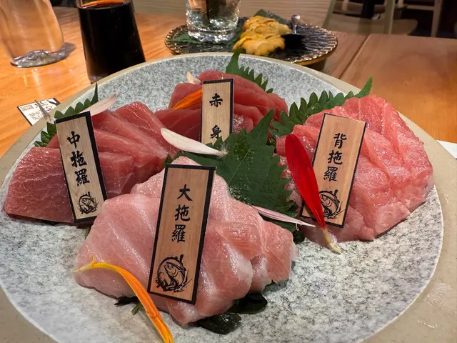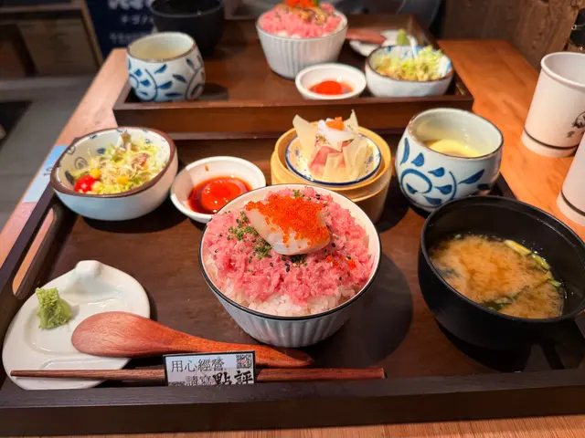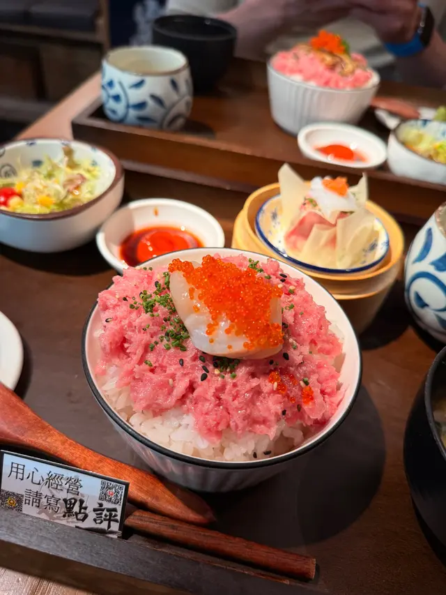 居然有嘢連我這個銅鑼灣地膽都吾知就係呢間藏於銅鑼灣渣甸街入的藍鰭吞拿魚專門店。豐鮪既然知道就要去試吓打開門一目了然, 客人自助落單、倒茶所以店員都好少行出黎 。我哋系晚上第一枱客人, 坐位任坐。第一時間見到有推廣優惠, 點一份肉餅飯, 第二份半價, 真心抵!定食包括了蟹膏燉蛋, 沙律, 麵豉。先吃燉蛋打底, 給胃內添點暖氣蟹膏冇腥燉蛋夠滑pass 帶子肉餅飯新鮮做手切藍鰭吞拿魚魚蓉+蔥碎+北海道帶子+日本珍珠吃前先加上醬油厚切帶子新鮮圓潤與咸鮮蟹籽是絕配再深深地夾起一大注藍鰭吞拿魚魚蓉配口感黏連珍珠米,吞拿魚蓉棉細口感, 中融鮮度,也喜歡加上葱花的令香味更提升。鹹蛋肉餅飯新鮮做手切藍鰭吞拿魚魚蓉+蔥碎+日本蛋黃豉油漬+日本珍珠米第一次見藍鰭吞拿魚配咸蛋,相當有創意筷子一篤下咸蛋黃爆漿滲入珍珠米內, 再加少許醬油撈埋藍鰭吞拿魚魚蓉送入口, 創意之餘味道也不错。埋單兩個人只須$227冇加一依個價錢可以食到藍鰭吞拿魚系邊度搵呀!…查看更多