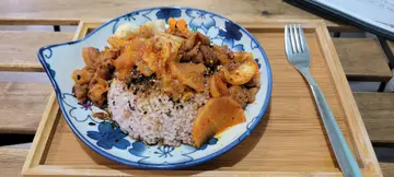 卤肉饭个饭都系猫头形,贯彻餐厅主题,全部都系猫。白饭混入咗红米,感觉健康啲而且有唔同口感,伴碟有少许烚蔬菜,半只糖心蛋,卤肉调味唔太浓郁,卤肉系肥瘦相间猪肉粒,有菜脯豆干洋葱一齐煮,餐厅烹调手法健康简单,可以食到食材原味,偏向家庭式感觉而呢个家庭系有猫嘅,呢度嘅猫好多都系有经历,所以唔好咁主动,好似喺屋企食饭就可以午餐可以半价转餐牌上饮品,今次试下安睡茶,有花香同薄荷味,茶隔超可爱太浓味仲可以先放一旁,可以无限加热水,我加咗几次仲好浓味,店员都好乐意帮忙加水