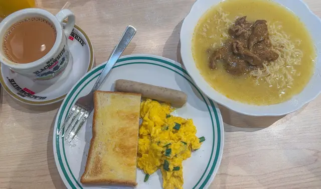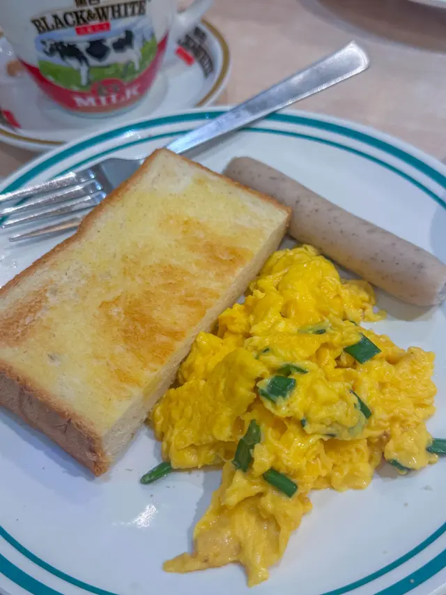 現在的冰室都是走光猛明亮的路線,餐點則是在基礎上加點新意!?不過「搭枱」文化這些倒是沒變。中午12點多到來已經開始有不少人等位。據說這間是以前在某連鎖茶餐廳的師傅出來開的冰室,不知道能不能從奶茶那裡找到熟悉的味道呢?常餐C.沙嗲牛肉麵配蔥花炒蛋 + 香草腸1條 & 牛油多士 (HKD 56)上餐速度都幾快,份量看起來也Okay。多士都夠脆,是麵包皮的部分比較硬,牛油中規中矩吧。蛋不算炒得好香滑,不過勝在有蔥花搭救。另外還有一條濃味的香草腸。麵偏腍了一些。不過軟腍的沙嗲牛肉夠惹味,整體來說沒什麼驚喜。奶茶的話會是香滑得來有少許回甘。查看更多