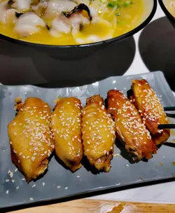 最近试咗北角一间米线小店,今次试咗两款招牌米线,整体有惊喜,同大家分享下~🍴 特浓新鲜蕃茄汤米线(鸡肉丝+生菜+萝卜)$65 ⭐️⭐️⭐️⭐️汤底真系够浓郁,饮得出用新鲜蕃茄熬制,酸甜自然,带微微辣劲,好开胃!鸡肉丝撕得够幼,吸晒汤汁好入味;萝卜煮到软淋,清甜无渣;生菜爽脆,加埋一齐食口感丰富。$65 呢个价钱算合理,蕃茄控可以一试!🍴 元祖金酸鱼片浓汤米线(炸鱼皮)$82 ⭐️⭐️⭐️⭐️金酸汤同一般酸菜鱼汤唔同,酸得嚟温和,带少少香料香,唔会太刺激。鱼片份量足,嫩滑无骨,追加嘅炸鱼皮浸汤后半脆半软,吸尽汤汁好过瘾!如果钟意酸辣口味,呢款值得一试~🍴 巴蜀狂惹鸡翼 $29 ⭐️⭐️⭐️鸡翼即炸上枱,外皮几脆,蜜糖同黑椒嘅配搭算惹味,不过肉质未算好Juicy,可以再改善。如果钟意香口小食,都可以试下,但未算必点。📝 总结* 蕃茄汤米线系必试之选,汤底真材实料;* 金酸鱼片汤适合钟意酸辣但唔想太重口味嘅人;* 鸡翼中规中矩,可以一试但未算惊艳。