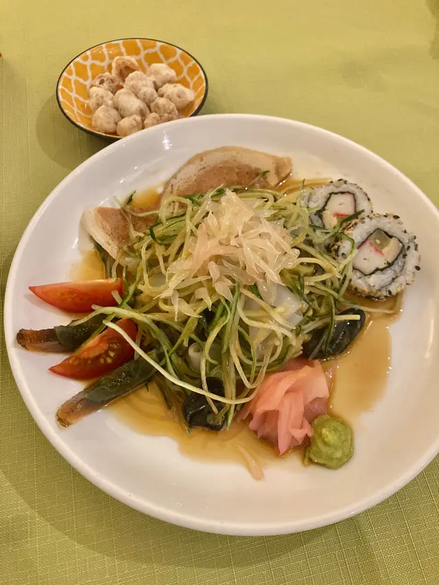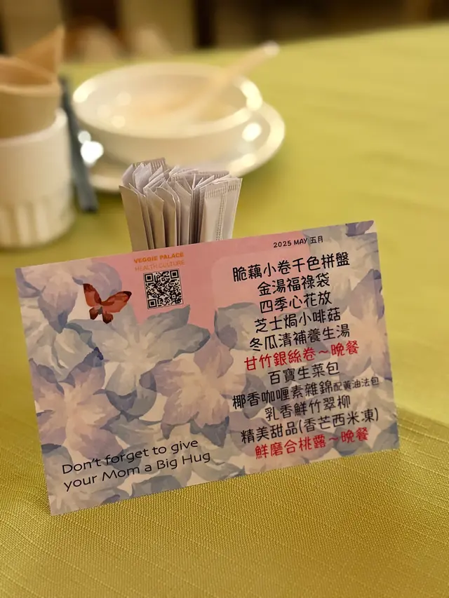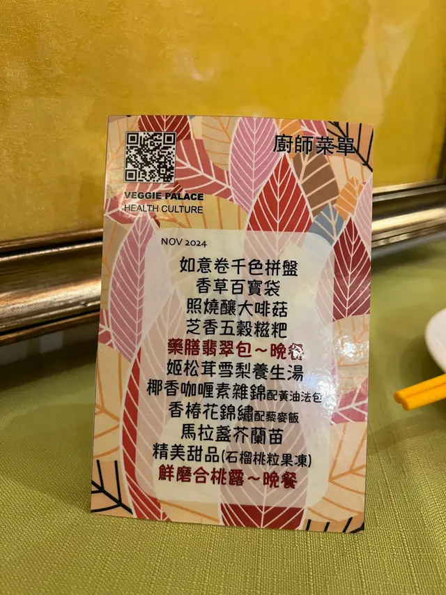 闰蜜的契女与家人为我庆祝生日,因为可以作主便选择以素食庆生。餐厅每月更换菜单,4月的菜单如上。🥬三文鱼千色拼盘千色拼盘够冰冻,三文鱼的口感做得相当逼真,但此物不少素食餐厅也有相同出品,最喜欢的是置于中央的瓜菜丝沙律,清脆爽口,若然可以把不同的食物分开盛载,防止串味,感觉更好。🥬鲜茄翡翠元宝元宝皮有点厚,不是喜欢的类型,饀料以素肉为主也不是喜欢的食材,最欣赏的是微酸的蕃茄汤底。🥬酪梨脆豆腐脆豆腐是较喜欢的菜式之一,轻炸的豆腐外皮非常薄脆,衬以油滑的牛油果,口感味道同样平衡。🥬火龙胡桃挞名字说明一切,简单的小食,火龙果质素不错,微微的果甜是整个小食的亮点。🥬甘竹银丝卷银丝卷也是这晚较喜欢的菜式之一,一向喜爱腐皮卷,皆因其豆香浓郁。是晚的银丝卷炸得香脆,酱汁的浓稠度亦恰到好处,既可以包裹银丝卷令其脆中带软,也为其增添酱香。🥬粉葛牛大力养生汤养生汤说是粉葛和牛大力熬制而成,却喝不出来,但味道还是可以的,汤内有很多红萝卜,反而不见其他食材,这或许说明养生汤的味道主要来源。🥬豉香味菜花锦绣配藜麦饭菜式十分家常,在家偶尔也会烹调类似的菜式,当然餐厅的配料和调味均较丰富。🥬椰香咖喱素杂锦配黄油法包素杂锦材料多样,有豆腐卜、车厘茄和不少根茎蔬菜,最有趣的是素鱼蛋,虽未至于几可乱真,但还是让我有一丝惊喜,因为素鱼蛋与风行已久的豆类素肉口感完全不同,加上咖喱酱汁的加持,菜式顿时变成高仿品。🥬芙蓉烩时蔬简单清淡的蔬菜,时蔬是西兰花而芙蓉是蛋白和金针菇炒制而成,加上点点仿烟肉粒,感觉清爽无负担。🥬香芒西米冻店家知道这枱客人中有人生日,便在西米冻的盛器加上蜡烛模仿成西米冻蛋糕,西米冻的芒果味突出,不失为一个不错的甜品,但若可选择,新鲜的水果更合心意。🥬鲜磨合桃露合桃露味道一般,口感黏稠,与其说是合桃露还是改为合桃糊比较恰当。…查看更多