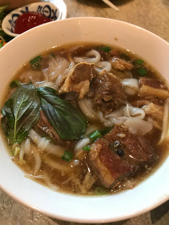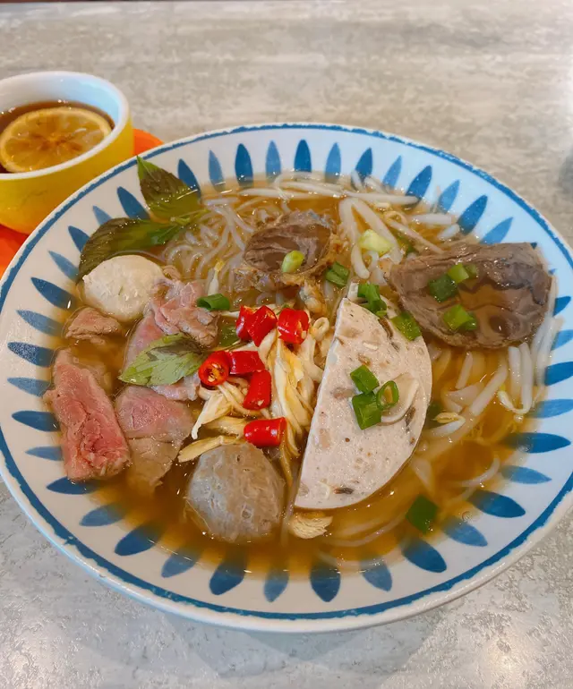 喺附近做完野近近哋去咗越南餐廳食飯中午嘅時間都幾多人, 要等咗差唔多五分鐘先有位越式火車頭河粉(轉檬粉)超級多餸一碗麵, 有 札肉、生牛肉片、雞絲、牛展、豬肉丸同牛丸, 湯底有濃厚嘅牛骨味, 裏面仲有洋蔥、芽菜, 芽菜條條都好肥大, 咬落去超級爽脆, 肉方面都係好味嘅, 食完唔會黐牙跟餐嘢飲:凍檸茶正正常常唔會太甜, 亦唔會係超級多冰嗰隻調味料:青檸、辣椒有啲辣椒仔同埋有半塊青檸另上, 鍾意食辣嘢嘅朋友記得加多啲辣椒咗碗湯度啦!我就加到三四粒就覺得好夠辣!查看更多