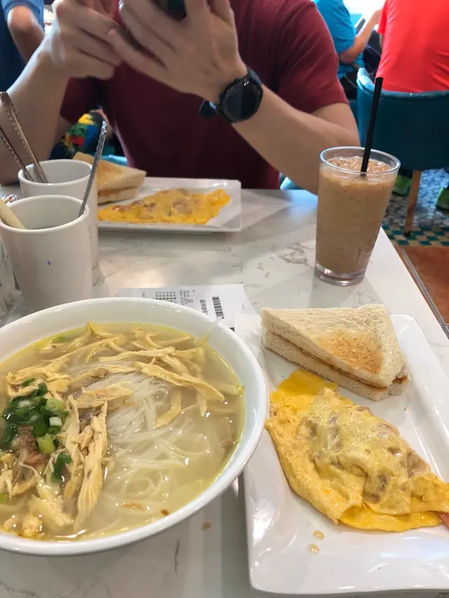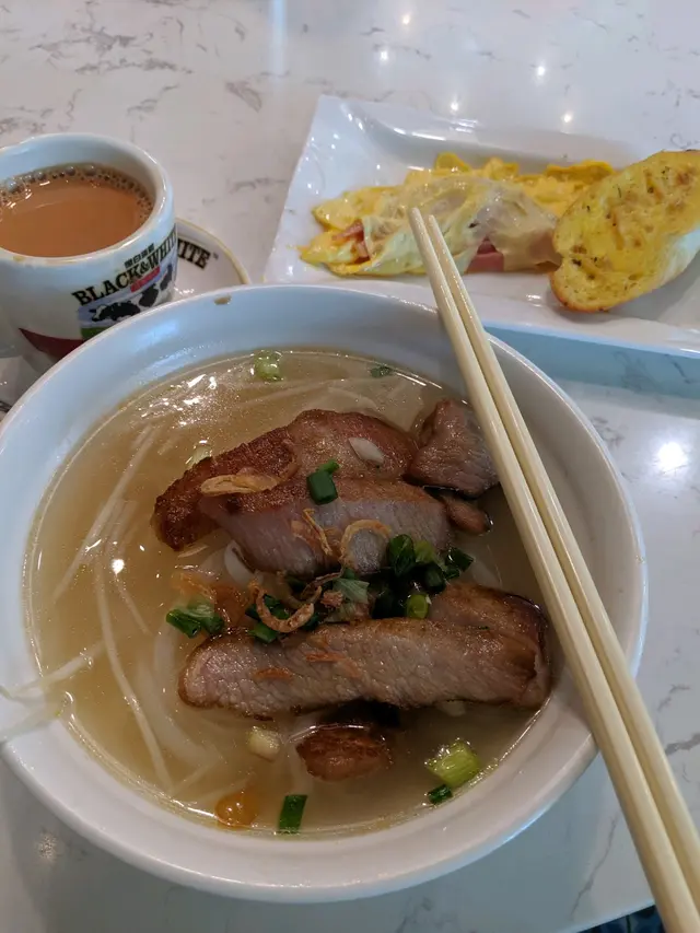 番工經過左呢頭附近,好似都多街坊生意,所以就入左呢間餐廳。🙈平日 lunchtime唔使排隊,即刻有位,坐大枱。meun都係越南野多,又有海南雞飯。午餐都包餐飲,我就叫左個茶餐,包野飲,有omelette with ham 仲有蒜容多士。個豬頸肉湯河不過不失啦,河粉唔算太淋,豬頸肉都係夠味既。omelette反而算係咁多樣入面好食既,好多火腿。而個蒜容多士就夠哂牛油嘞。但唔算平價既,如果下次黎到又唔使排可以去試一次查看更多