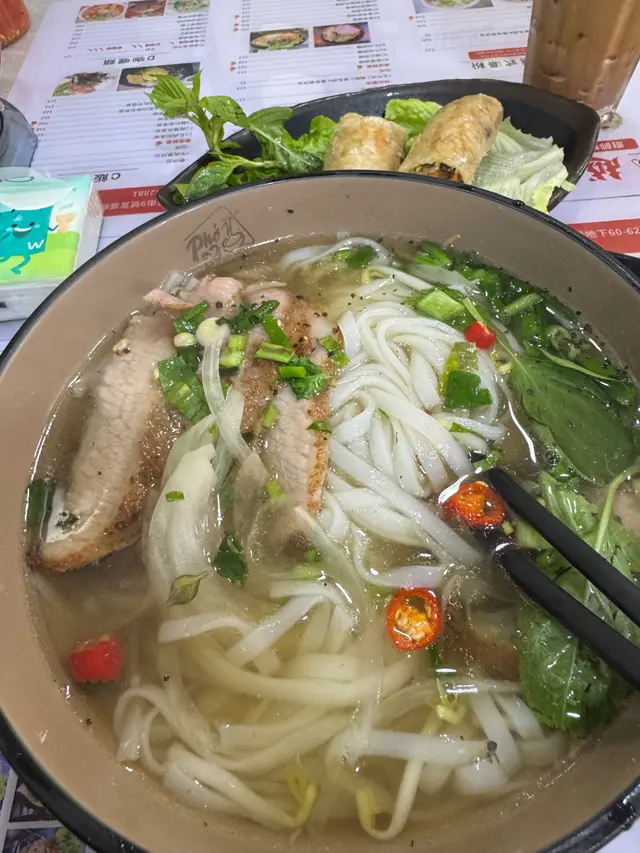午餐經過見到好多人排隊,又有時間就試吓。叫咗豬頸肉湯河、越南春卷,同埋一杯越南泡沫咖啡。豬頸肉湯河非常普通,湯底尚可,約$5-60一碗湯粉,沒有跟餐飲品,價錢小貴。春卷都幾好,熱辣辣炸起,春卷皮夠脆,餡料都幾多