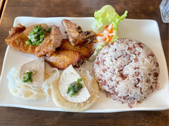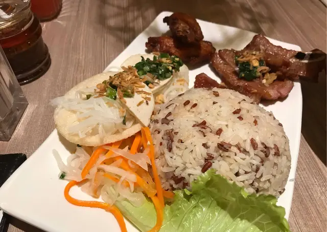 健康三色紅米飯$64香茅豬扒,有淡淡香茅味肉質鬆軟唔會好乾;香茅雞翼直得一讚👍🏻,煎得非常香脆;越式扎肉蝦片,蝦片都脆卜卜,加少少檬粉汁食更美味,紅米飯軟硬適中。整體來說,不錯吃!查看更多