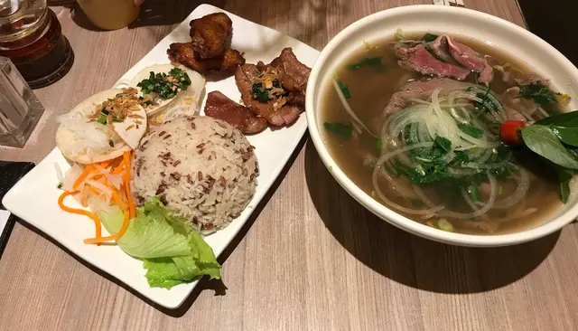 很耐冇食的抵食越南餐廳「越棧」之前試過佢地既撈檬,今次就試下個飯,朋友點了生牛肉河,我偷吃了幾啖都覺得幾好食沒有加一的收費,份量恰到好處,紅米飯,香茅雞翅跟扎肉蝦片!飯還吃不完。湯河很好吃,牛肉剛剛熟,個粉比我們港式的更薄一點,很吸湯!咁樣食人均才50塊錢左右,就能享受異國風情,還不錯啦查看更多
