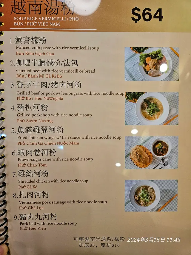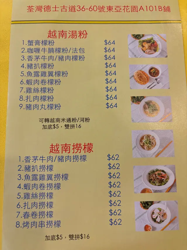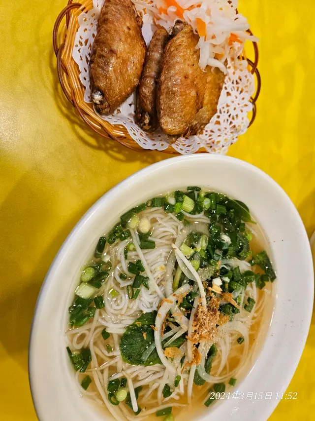 今日去小紅書同Openrice都好多人贊的越南餐廳。因為12點前去到,所以無乜人。舖頭主色黃色,都幾醒神,當然吾覺得有特別越南特色。雖然樓面得一個伙計,服務方面基本到位。價錢就其實同旺角油麻地也差不多,所以吾系便宜,尤其是吾系餐無野飲。另外,2蚊一個外賣盒好似貴d牛肉河粉 ($64)2分—湯底吾夠平時食開越南湯粉咁和味,—牛肉睇落幾好,但食落就比較鞋—河粉比較厚同鞋。雞翼撈檬($64)3分—雞翼真系好香脆,但過火左DD,肉覺得鞋—檬粉系白色似米線,吾同其他越南餐廳食開的透明同幼。但網上話其實檬粉系米粉,所以可能佢系正宗,anyway,個人prefer透明。查看更多