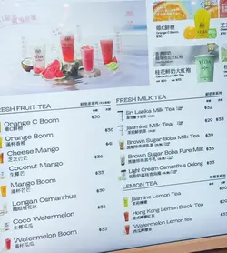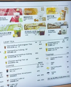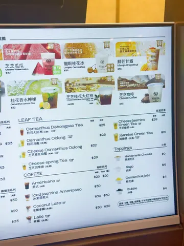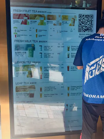 。在柜台旁,放了一整枝茶叶原叶,包括茉莉花绿茶及桂花十红袍,以及纸巾、纸饮管,摆放整齐。不得不顺带一提,店家的纸饮管质素甚高,不易变软。巨型显示屏陈列出所有饮品,包括鲜果茶系列、鲜奶茶系列、原叶茗茶、柠檬茶系列及咖啡系列。在路旁的广告架所显示的几款饮品是店家推介,此外,更提供很多开业优惠