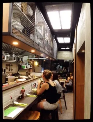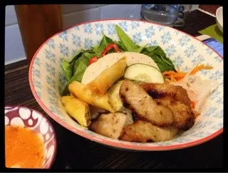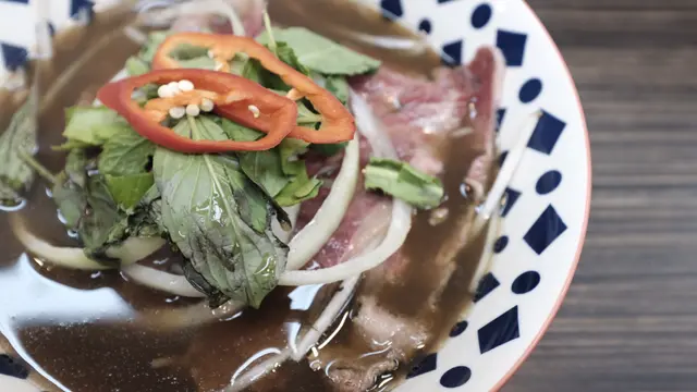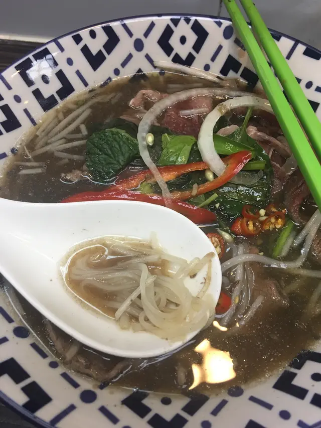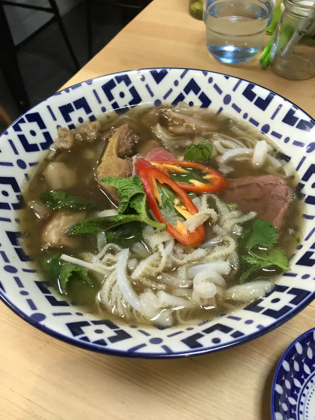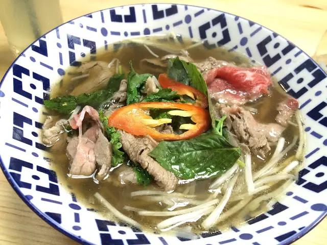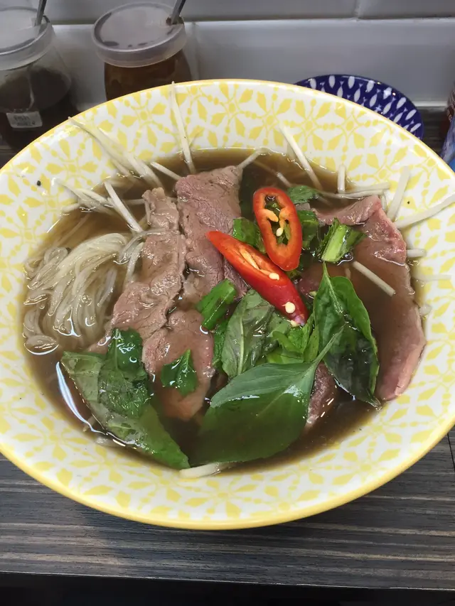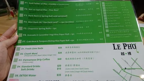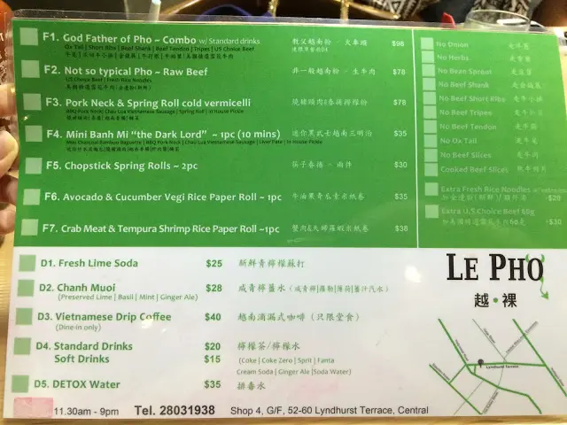午飯時間,中環餐廳難找空位,未知這家小店是否被路政署修路影響,約可容納廿人,但那天客人並不多。老闆有點眼熟,想了又想,終於記得之前在日本餐廳Naked見過他。他是混血兒,跟老撾有淵源,自小常吃祖母煮的越南河粉(PHO),所以這店就主打家傳風味的PHO。招牌的教父越南粉($98),名字有點搞爛gag,不過單看賣相很足料,牛尾、牛肋骨、柏葉、孖筋、金錢展,加雪花肥牛,跟我常見的生牛肉湯河有很大分別。先大喝一口湯底,有很濃的八角、茴香味道,而且薄荷葉不多,令湯味感覺更濃,略嫌稍鹹。老闆說這是南越風味的PHO,用了很多香料,加牛骨、牛骨筒的油來熬,有別於本地常見的北越湯河的清新味道。他建議我把小角青檸榨汁,拌入湯底,味道更佳。把金錢展、半生熟的肥牛夾著芽菜吃,的確很惹味。浸在湯中的河粉換成泰國金邊粉,口感彈牙一點,亦不怕浸腍。迷你越南三文治($35),老闆自家造竹炭麵包,夾著豬頸肉、肝醬、扎肉跟醃菜,份量有點少,但是醬汁酸甜辣,很惹味。醬汁大概是是拉差醬,混沙律醬,兩者原來這麼夾,自己回家也得試混醬一下。蟹肉天婦羅蝦米紙卷($38)紅色那份是紅菜頭汁製的米紙卷,白色那份是普通版本,同樣包著蟹肉及天婦羅蝦,水準還可以,可能是因為吃了河粉及竹炭包,前兩者味道濃,顯得這米紙卷不太突出。總結來說,這樣重口味的北越PHO於本地少見,竹炭包亦很正,小店風味值得支持。…查看更多