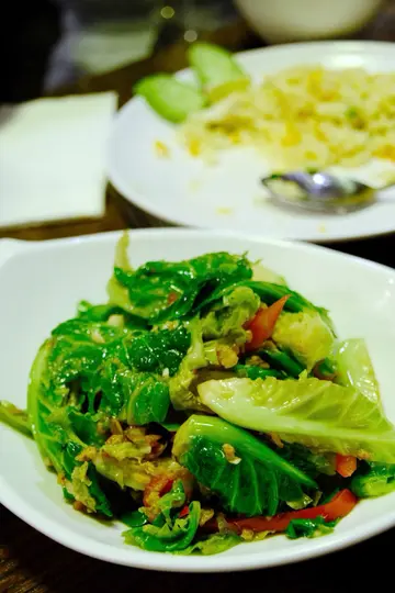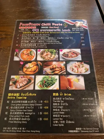 餐牌上面一开始系用泰文之后就系英文,真系要翻译几句先睇得明。听日佢又午餐餐牌叫咗一个猪颈肉炒饭,泰式芥兰菜。份量适中一个女仔都食得晒,猪颈肉唔会太肥,而且份量都正常。之后我哋仲嗌咗一个鸡肉干炒河,系我好钟意食嘅泰式河粉,比起平时嘅河粉会长啲扁啲,而且黏啲,份量都好适中,捞埋炒蛋食好好味
