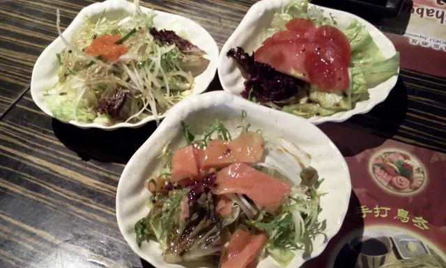 遊食吟嚷居酒屋距離公司大約5步到的位置, 十分方便呢,有時LUNCH想出去食, 又唔知食咩好就去呢間食, 貪佢夠近! 味道又OK~12:30去到的時候, 人流不算太多, 可以不用訂位。這次又是叫了SET LUNCH, 天婦羅烏冬配炸雞塊。如不想配炸物, 也可配上三文魚壽司/煎餃子呢! 先上SET LUNCH包括的沙律, 再來是炸雞塊, 雖然只是小食碟,不過熱辣辣的炸雞塊, 肉質嫩滑, 算是很不錯!天婦羅烏冬, 份量不少, 烏冬好在唔會"成餅野", 但當然不能與現在很流行的拉麵店相比, 而湯底都幾惹味。炸天婦羅另上, 有炸蝦/蕃薯/矮瓜等。而同事的蕃茄牛肉湯拉麵配三文魚壽司, 之前也有食過此蕃茄湯底,酸酸甜甜的滿討好。最後配上凍檸茶一杯, 對於熟食要求不高的我, 挺滿足的一個LUNCH呢!查看更多