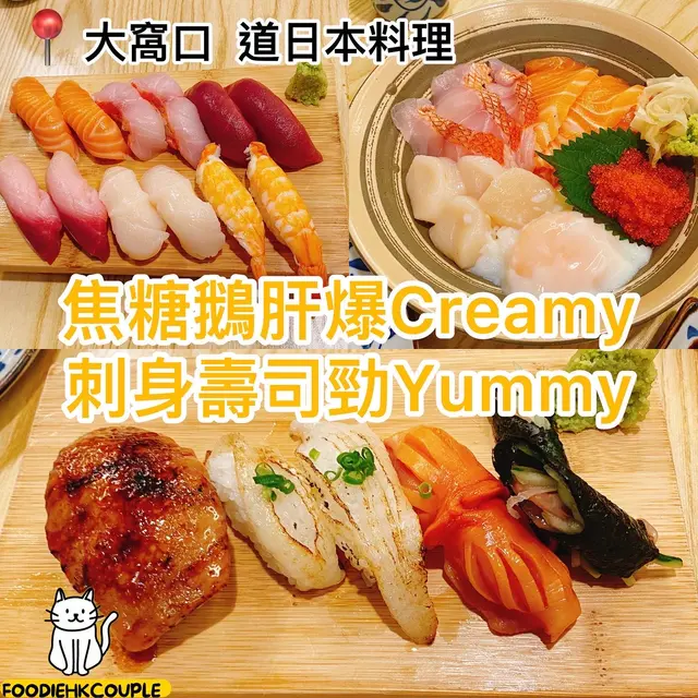今日嚟到大窩口嘅一間小店叫做道日本料理,呢間小店都係小編嘅朋友介紹嘅,朋友話呢間小店抵食好食,叫小編一定要推介畀大家。所以今日小編就嚟會一會佢喇!三色魚生丼飯 $80呢個三色魚生就包括有帆立貝三文魚同鯛魚,仲有蟹子同埋溫泉蛋,但非常之新鮮完全冇腥味,撈埋溫泉蛋食魚生飯口感非常之順滑同豐富。蟹子沙律 $32蟹子沙律都係基本嘅蟹籽、青瓜絲同蟹柳絲,加埋一啲嘅沙律醬。但呢個價錢嚟講其實都算非常之大份,小編都會推介嘅!焦糖鵝肝壽司 $42呢個鵝肝壽司真係不得了,小編最初只係諗住試一件咋,但系好食到小編即刻再加單。鵝肝燒到勁香,口感有少少creamy,入口即溶嘅,配合埋一啲嘅焦糖味同油香,成件壽司已經得到層次上嘅昇華!新鮮拖羅海鮮卷 $128呢個海鮮卷非常豐富呀,海鮮卷入面包住帆立貝,面層有大量拖羅茸,亦有醃蘿蔔同三文魚子,底層軍艦核心仲有帆立貝。口感同味道都好好!整體嚟講,魚生新鮮,性價比高!不過小店始終比較細,有心去試,建議大家預早少少訂定位!查看更多