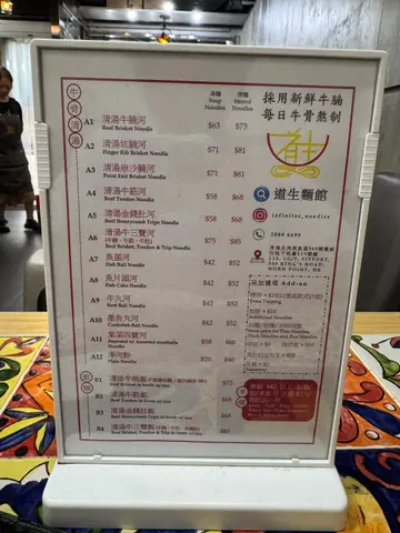 道生面馆系比较近期去既一样话系用新鲜牛系各方面人气都好高同之前既传承有得挥连花恤衫同米纸战狼都大推好似日日都排长龙不过因为话老板师傅本身是系做呢行所以出餐就比较慢咁我就揾左个星期六特登早d搭过海巴去排队位置就系健威坊地下东隧巴士通常过完隧道就可以系附近落车算方便餐厅十一点半开门我就大约十一点三去到无数到有几多人总之有条队就排左先真系十一点半左右就开始放人入来呢度好特别要派筹既一组人一张跟顺序落单而我呢就岩岩好系十个筹之外岩岩好系入唔到第一转即系再早多少少黎就得但其实入面系仲有位净既只系筹就系得十组十组之后就唔比入住中间有人经过入黎买外卖完全唔洗排队就咁插左系我之前落单咁又得wor后尾坐低食野再听到老板娘同客人呻话乜野堂食外卖都同一条队无得快架我hi你系呀外卖都系跟次序煮呀但系可以插队唔洗排呢你话你出餐快都话你就系出得慢先唔比人入去ja ma咁那样都做得出咁又再系门口等左十五分钟十一点四十五分入得我就系第二轮既一号筹餐厅唔大餐牌崩沙腩每日得三四碗唔系排头一二位都无咩可能食到所以唔洗谂佢餐牌就无爽腩既但成日上网都见到d人话食到爽腩米纸战狼又系叫爽腩我就唔知咩玩法咁一个人要搭台都系必然既配料之不过佢d凳有d有得埃有d又净系得胶凳而我果张就系胶凳系等得好辛苦既尤其系五分钟后落单仲要再等多43分钟先有野食而我坐低搭台第一轮果三位都仲未有面食既成个用餐流程就系我11:13去到排队餐厅11:30开门入晒十组岩岩好到我唔入到11:45终于第二轮入去11:50落单12:30开始话无晒坑腩12:33先有得食12:45离开咁其实我系唔认得边个排系我后面但我都feel到第二轮好多人都有面上而我系无既问个老侍应佢反而仲话系格离台果位食左我个面明明就系上错左更何况你有晒筹有晒顺序咁有程序我系唔明点解咁都可以上漏亦都可以有人外卖插队认真我一个人就无咩所谓如果系其他人既话一定hi到7彩加6蚊既冻柠茶基本系挨唔到去个面黎都饮晒架啦无崩沙腩就一定系食坑腩呢个星期六就去到十二点半卖晒个样系整齐既有些少筋膜食落系比较瘦但并唔系柴亦都唔会un系好软好易咬唔会痴牙之不过就唔系想像中咁好食感觉系比较似牛腩有时我老母都会去街市买新鲜牛腩番黎整咖哩腩个口感就真系好鬼似个汤系比较清同淡有少少既牛味另外系个河粉呢都系麻麻地夹上黎都散晒跌番落去唔完整既亦都唔爽口咁呢方面连八宝都好过佢整体感觉就系好既牛腩配差既河粉仲有都见到唔少人去单点个萝卜黎食埋单69蚊平过传承牛唔差不过亦都无想像中咁好同埋河粉麻麻老板娘系有礼貌既多谢前多谢后不过又可以比人外卖打尖入队又可以上漏面就真系差如果都系一样要排队既话我番去传承食好过而且佢下午去到都可以食到坑腩另外餐厅虽然排晒队但全部都系香港人完全无支那呢点又系几特别可能都去晒狗记同华姐…查看更多
