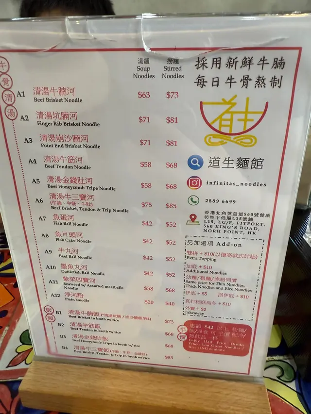 道生麵館係比較近期去既一樣話係用新鮮牛係各方面人氣都好高同之前既傳承有得揮連花恤衫同米紙戰狼都大推好似日日都排長龍不過因為話老闆師傅本身是係做呢行所以出餐就比較慢咁我就搵左個星期六特登早d搭過海巴去排隊位置就係健威坊地下東隧巴士通常過完隧道就可以係附近落車算方便餐廳十一點半開門我就大約十一點三去到無數到有幾多人總之有條隊就排左先真係十一點半左右就開始放人入來呢度好特別要派籌既一組人一張跟順序落單而我呢就岩岩好係十個籌之外岩岩好係入唔到第一轉即係再早多少少黎就得但其實入面係仲有位淨既只係籌就係得十組十組之後就唔比入住中間有人經過入黎買外賣完全唔洗排隊就咁插左係我之前落單咁又得wor後尾坐低食野再聽到老闆娘同客人呻話乜野堂食外賣都同一條隊無得快架我hi你係呀外賣都係跟次序煮呀但係可以插隊唔洗排呢你話你出餐快都話你就係出得慢先唔比人入去ja ma咁那樣都做得出咁又再係門口等左十五分鐘十一點四十五分入得我就係第二輪既一號籌餐廳唔大餐牌崩沙腩每日得三四碗唔係排頭一二位都無咩可能食到所以唔洗諗佢餐牌就無爽腩既但成日上網都見到d人話食到爽腩米紙戰狼又係叫爽腩我就唔知咩玩法咁一個人要搭檯都係必然既配料之不過佢d凳有d有得埃有d又淨係得膠凳而我果張就係膠凳係等得好辛苦既尤其係五分鐘後落單仲要再等多43分鐘先有野食而我坐低搭檯第一輪果三位都仲未有麵食既成個用餐流程就係我11:13去到排隊餐廳11:30開門入晒十組岩岩好到我唔入到11:45終於第二輪入去11:50落單12:30開始話無晒坑腩12:33先有得食12:45離開咁其實我係唔認得邊個排係我後面但我都feel到第二輪好多人都有麵上而我係無既問個老侍應佢反而仲話係格離檯果位食左我個麵明明就係上錯左更何況你有晒籌有晒順序咁有程序我係唔明點解咁都可以上漏亦都可以有人外賣插隊認真我一個人就無咩所謂如果係其他人既話一定hi到7彩加6蚊既凍檸茶基本係捱唔到去個麵黎都飲晒架啦無崩沙腩就一定係食坑腩呢個星期六就去到十二點半賣晒個樣係整齊既有些少筋膜食落係比較瘦但並唔係柴亦都唔會un係好軟好易咬唔會痴牙之不過就唔係想像中咁好食感覺係比較似牛腩有時我老母都會去街市買新鮮牛腩番黎整咖哩腩個口感就真係好鬼似個湯係比較清同淡有少少既牛味另外係個河粉呢都係麻麻地夾上黎都散晒跌番落去唔完整既亦都唔爽口咁呢方面連八寶都好過佢整體感覺就係好既牛腩配差既河粉仲有都見到唔少人去單點個蘿蔔黎食埋單69蚊平過傳承牛唔差不過亦都無想像中咁好同埋河粉麻麻老闆娘係有禮貌既多謝前多謝後不過又可以比人外賣打尖入隊又可以上漏麵就真係差如果都係一樣要排隊既話我番去傳承食好過而且佢下午去到都可以食到坑腩另外餐廳雖然排晒隊但全部都係香港人完全無支那呢點又係幾特別可能都去晒狗記同華姐…查看更多