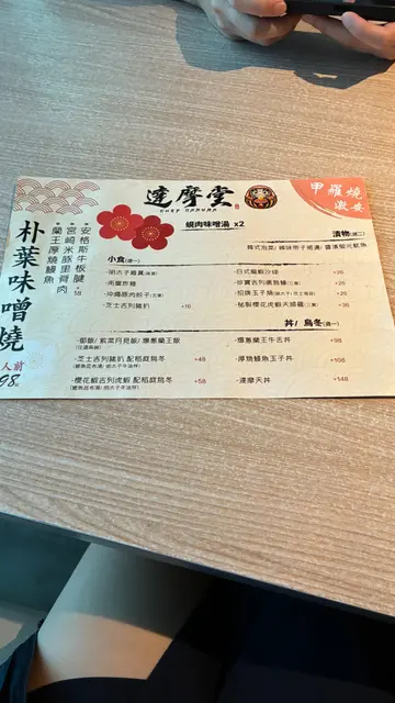 系社交平台见到呢间餐厅~生日画碟真系惊艳到我🤩餐厅用达摩做主题🎏 入面装修都几靓坐得都算阔落 不过建议book位先有卡位🤟🏻食咗2人餐 都够饱 朋友都钟意🥰🍴2人餐 ($388)📍前菜:韩式泡菜 + 酱渍萤光鱿鱼泡菜爽脆,酸度同辣度平衡得啱啱好👍🏻仲带点蒜香,开胃一流!鱿鱼爽口弹牙🦑啖啖肉 唯一觉得酱汁略为浓咗d 食多两啖会略为腻🥹📍汤品:蚬肉蛋花味噌汤鲜甜嘅蚬味即刻爆发~~蚬肉够肥美,蛋花幼滑😍汤底浓而不咸不过蚬肉份量可以再多啲 饮完有啲意犹未尽😂📍小食:芝士吉列猪扒 (+$18)外层炸得金黄酥脆 切开咗见到好多芝士🧀猪扒厚实多汁,味道层次好丰富~一啖咬落去嘅时候系好拉丝🤩🫶🏻炸皮都唔会好厚🔥但系记得趁热食📍主食:安格斯寿喜锅(+$48)牛肉片嫩滑多汁🐮吸晒甜咸嘅寿喜烧酱汁配菜有冬菇、金菇、南瓜、豆腐、粉丝..佢嘅汤底浓郁又唔会太甜,仲可以加蛋浆🥚牛肉份量适中!但食肉兽可能要加单点😹📍主食:宫崎A4和牛丼(+$68)当晚嘅MVP👑 和牛真系入口即化、纹路都好靓😍配上微甜嘅酱汁同半熟蛋黄 捞饭💯呢碗饭唔使5分钟2个人就食晒~📍甜品:北海道抹茶蛋糕完美嘅收尾 因为生日画碟好靓🎂店员系拎咗一个宝箱 打开再点火~烧咗一张纸之后就见到生日蛋糕🥳当日仲送埋「即影即有」🫶🏻朋友劲开心好可惜抹茶味唔算好浓 红豆略甜🫘不过整体食落又未到腻!有机会嘅话想试吓另一只味hahaha…查看更多
