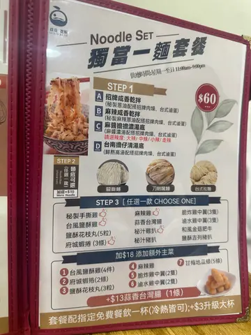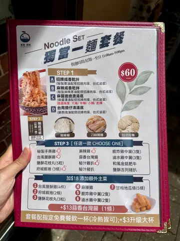 呢间主打台式干拌面同炸物小食,午市人龙少少但流转快,今次系冲住佢哋$60面套餐同台式小食去 。小店格局,翻枱快,等位大概十分钟以内;上枱速度也利落,适合去食个快捷台式午餐 。整体份量啱啱好,价钱亦唔使加一,午餐嚟讲算亲民;2:30后仲有$38套餐优惠, 有齐面、小食同台式饮品真系几抵食 。咸香干拌面(台湾拉面)卖相干净企理,面面上铺住肉燥、葱花、卤蛋半边同少量椰菜,拌匀之后酱油底带微甜,葱油香扑鼻;台湾拉面条身幼直、有嚼口,最重要系够「挂汁」,每口都有咸甜平衡嘅浓香 。配菜虽少但能中和油腻感 。台风盐酥鸡外层薄脆不厚粉,肉汁保持得唔错,轻轻辣度令味道更起 。台湾香肠切件后,面头油亮,咬落甜香突出,口感多汁,单食或伴面都好夹;咸甜味型偏台味正宗路线 。柑桔蜂蜜(热)清香柑橘味同蜂蜜酸甜度平衡,热饮暖胃又解腻,配盐酥鸡特别称职 ;可惜饮到最后有啲干涩。建议与贴士- 午餐繁忙时间要排小小队,但通常十分钟内有位;赶时间可先睇定餐牌入坐即点更快 。- $60套餐未使10%,包面+小食+饮品,性价比可以;如果时间允许,2:30后$38 set 更抵,想饱肚悭荷包就拣呢个时段 。- 口味偏重咸香,怕腻可选热饮或加菜…查看更多