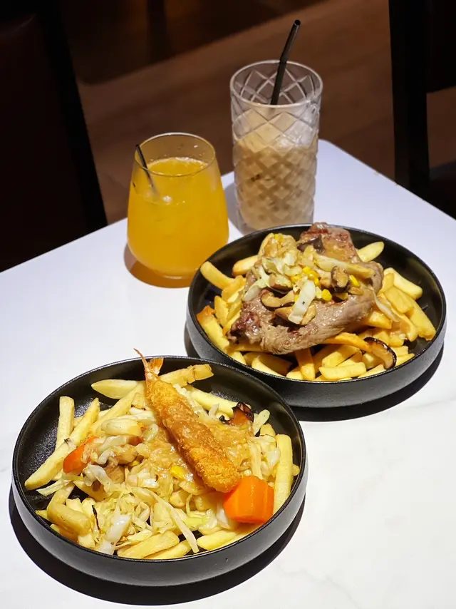 炸大蝦炒時菜薯條 & 紐西蘭草飼牛扒炒時菜薯條