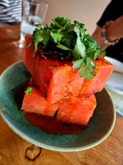 🍉Spicy watermelon was super refreshing, friends started making at home to fight for extremely hot summer 🐟Uroko-yaki Tilefish with Preserved Mustard Greens Fish Broth, crispy and the savoury sourness perfectly enhance the contrast of oily crispy fish🕊Perfectly pink, tender and juicy, yet, no lavender smell or taste as mentioned on the menu🦪Appalud to the watercress oyster, perfectly emphasized both ingredients signature flavors in a well-baalnced way with appropriate savoury flavors from land and ocean*Packed space, nice staff, good vibe, toilet bit...er...…Read More