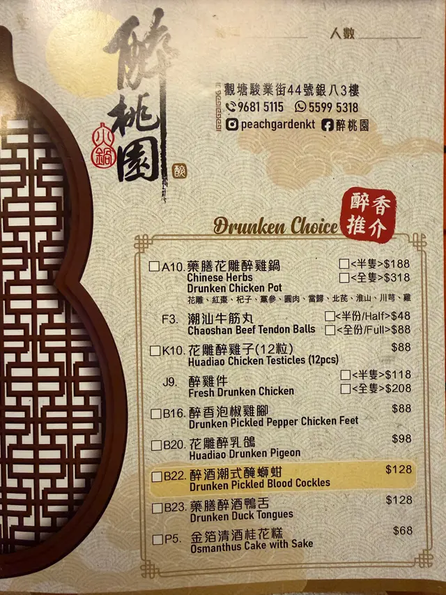 醉桃園 (观塘) 网上订位即赚Rice Dollars 网址: https://s.openrice.com/QrLS02l8B00 地址: 香港觀塘駿業街44號3樓 电话: +852 96815115