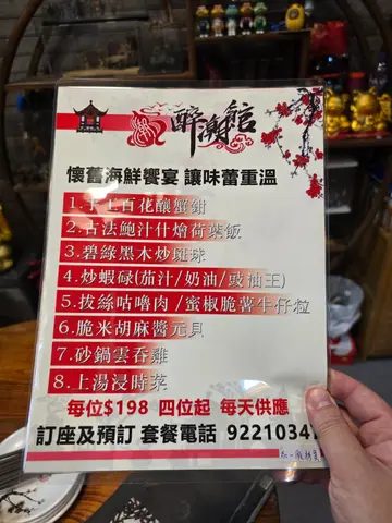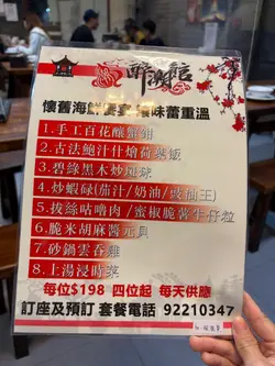 这间中菜馆位于荃湾三陂坊,主打正宗地道的潮汕菜式,能吃到特色地道的潮汕小食,其中潮汕砂锅海鲜粥更是招牌菜,价钱定位大众化,性价比好高!现于OPENRICE订座更可享九折优惠!店内环境宽敞舒适,装潢以传统的中式为主,适合家庭聚餐。怀旧海鲜飨宴 - $198/位(四位起)手工百花酿蟹钳严选肥美饱满的蟹钳,去壳保留完整蟹肉,鲜甜的蟹肉及弹润的虾胶好配搭,炸得外皮薄脆酥香,咬开爽滑弹牙有嚼劲好鲜味。古法鲍汁什烩荷叶饭阵阵荷叶的清香扑鼻,油亮的米饭吸饱醇厚的鲍汁而不黏腻,每一粒都软糯弹牙,还藏著瑶柱、虾仁、香菇及鸡肉等食材,饱腹感十足!碧绿黑木炒班球严选优质的龙趸鱼片,切得厚薄均匀,滑嫩弹牙而不腥,姜葱蒜的香气没有喧宾夺主,更突显其鲜甜味,还有脆嫩爽口的脆肉瓜和木耳。炒虾碌严选个头饱满的大虾,茄汁的酸甜比例调配得恰到好处,虾肉爽滑富弹性好鲜味。蜜椒脆薯牛仔粒选用优质牛肉,切粒大小均匀,软腍多汁而不柴,有浓郁的牛肉香;脆薯饼外皮酥脆可口,内里软糯香甜;蜜椒酱汁甜中带咸而咸中带辣,风味层次好丰富。脆米胡麻酱元贝选用新鲜大只的元贝,饱满又肥厚好鲜甜弹牙,有淡淡的海洋鲜味而不腥,脆米酥脆可口形成鲜明对比,胡麻酱浓郁醇厚却不油腻,带淡淡芝麻香气,咸鲜中带著一丝微甜。砂锅云吞鸡慢炖的汤汁奶白浓郁,鲜醇回甘,没有多余的调味。半边鸡鲜嫩紧实不干柴,鸡肉充分吸收了汤汁的鲜味,入味又易脱骨,鸡皮滑嫩不腻,充满鸡肉的原汁原味;鲜虾云吞用料扎实,皮薄馅大,虾仁饱满弹牙。上汤浸时菜新鲜脆嫩的豆苗,色泽翠绿鲜亮,长时间熬制的高汤鲜美醇厚,入口清甜多汁。…查看更多