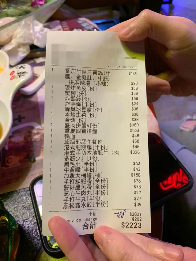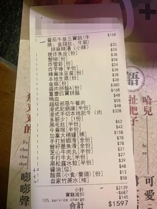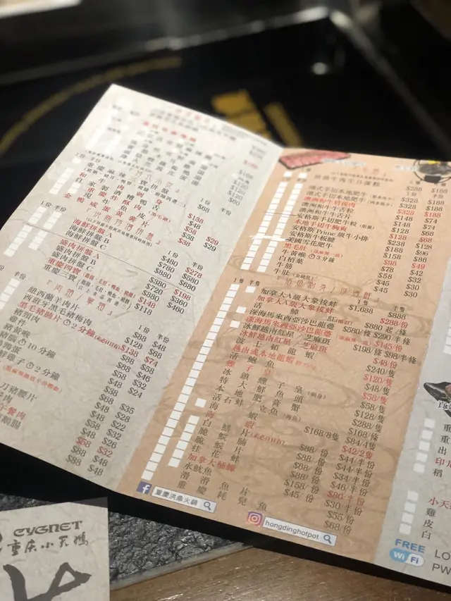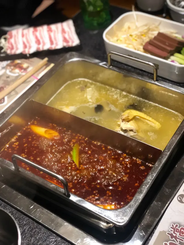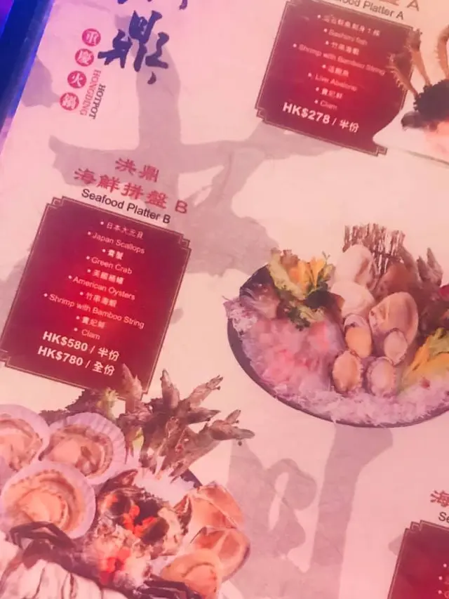 有招牌容易搵,落地庫即開波!馬拉松晚飯第三局尖沙咀,聽晚元朗,再將軍澳、上水、尖沙咀、大埔,磅數急速上升有排還喇!地方寬敞,檯櫈夠大,坐得舒服,不用頂手頂腳。四眼嬸嬸略為介紹一下優惠,居然有女仕之夜或男仕之夜,部份食材享有半價優惠。難怪慢慢步入大廳時,發現檯檯都係美女,真係美女既美女黎添呢!高高興興食足個半鐘,埋單每位 $500 蚊,完全在掌握之中。火焰蟹鍋不能鴛鴦相拼,無緊要就半辣湯半清湯。靚牛拼盤及海鮮擏盤各 3 種,應有盡有,豐儉由人,食材款色也不少,足夠使我們大塊朵頤開心幸福!朝日啤酒,正版無搵笨,我所喜愛的日本啤。嘉士伯催銷姐姐非常健談,跟眾同事們交談甚歡,有講有笑不亦樂乎。喬頭漬,真不知道何解叫作喬頭呢?其實係醃蒜頭來的。爽脆酸酸甜甜,開胃小食首選。炸豆豆,味道似綠豆,不過無咩肉食。咸咸地脆脆地,下酒都係一般般。自家製酒糟鴨舌,涼浸浸脆爽,不夠滑溜不夠飽滿肥美,味濃過咸平凡沒特別。正宗洪崖洞麻辣鍋中辣拼養顏木耳雞湯,有蔥段、芽菜及鴨血另上。兩邊平均分配全部倒進湯底裡,養顏木耳雞湯已有舊未熟下庄在浮沉著。時間都晚咯,各食家都望住隻雞髀虎視眈眈,奈何未熟唯有轉戰鴨血。用我最大耐性忍耐著,最終雞髀整隻落入我手中!客氣生疏食少好多,我唔客氣喇﹗堅係新鮮雞,不是冰鮮不是雪藏,那種掩飾不到的鮮甜雞味,甘香無比,皮滑肉嫩!狠狠地一二三四大大啖咬,散發著野蠻原始的味道。本地手切牛胸爽,太多的名字。牛白肉?牛心鼎?牛胸油?拖兩拖、縮兩縮,就要立即進食!否則牛油原全溶掉就不如不吃,會非常浪費。油潤地跣到舌頭,爽滑彈牙,每口溢出甘甜牛汁,惹味美妙!港式手切本地肥牛,眼測油肪油花都平庸沒驚喜,讓她游游水變成粉紅色就可以立即享受。其貌不揚,但牛味特濃彈滑滿意,比澳洲和牛享有更純厚的牛味及牛甜味,優質可以添食。洪鼎盛肉併盤丙,索價 $880 蚊可接受。澳洲和牛肩後肉比牛胸肉稍好一點點,最低限度不散有肉食。澳洲和牛牛肩卷、澳洲和牛三角肉,兩者不相伯仲穩守頭二位置。滑嘟嘟牛味飄香,陣陣乳香脂甜回味無窮。澳洲和牛牛胸肉,差少少整片都係白。灼一灼即縮半散,肉碎一樣,沒幾啖肉食到。澳洲和牛牛丸,首次相遇黐孖筋的極品!此丸只應天上有,牛味清甜不濁,大大粒爽滑激彈,爆汁滴滴追住食。黑毛豬腩片,脂肪比例十分平均,不用烚太耐,我喜歡的 9 成熟淺粉紅色最嫩最多汁最鮮甜!天然豬甜味濃到假的一樣,鬆軟的質地想一食再食,食過翻尋味。馬刀貝,珍寶的體形難得一見!開口即食,肥美飽滿,嬌嫩彈彈,貝汁橫飛,鮮味運行全身!重慶四寶,刀功利害,排列整齊骨子,觀賞度極高,全部都係麻辣良伴,就讓她們一家團聚吧﹗黑毛肚爽脆吸湯,趙得興奮,麻辣先辣後甜刺激可口。鴨血耐心等候,麻辣湯慢慢滲到中心處,鴨血微得軟軟滑滑,外脆內嫩,甜美無限。豬腰薄切考刀法,嚥嚥韌韌微甜不羶。鵝腸洗到白雪雪,片開鋪平非常靚仔,拖拖幾秒即掉入口,純天然鵝甜味,爽到索索聲,無得頂!洪鼎海鮮併盤乙,日本大元貝巨形極厚身,香噴噴結實味濃不乏帶子肉汁舔舔脷。膏蟹新鮮度不容置疑,甜甜的蟹肉,甘甘的蟹膏,不過不失。大家太客氣斯文,蟹蓋就由的我處理吧!蟹膏半滿,有軟有硬,軟膏嫩滑水潤甜美,硬膏結實甘香。美國桶蠔不是大就好食的,中呎碼最嫩最滑最甜,巨大桶蠔起渣有沙不喜歡。竹簽海蝦腳印印生猛活潑有如萬馬奔騰,蝦肉超爽勁甜損得非常開心!五色火鍋小籠包,全部一齊落水深潛,大家都完全忘記,已失救了!極易分解的包皮,要格外照顧,依家濕透腍劈劈一夾粉碎!最後包皮完全回歸自然,溶化到湯汁中消息得無影無蹤。淨係夾到舊肉餡,十分結實帶鞋不彈的肉丸,感受不到什麼非食不可理由。青菜併盤乙,就算餐牌寫住娃娃菜、本地生菜、西洋菜,都要視乎當天供應!娃娃菜、本地生菜、大白菜,爽甜翠嫩滿意滿意。正宗洪崖洞麻辣鍋中辣拼養顏木耳雞湯,養顏木耳雞湯,最後用帝皇海鮮雜肉雞濃湯作結。精華所在,百味交錯,魚蝦蟹蚌,雞牛羊豬,菜菜菜菜。稻庭烏冬,米香突出非凡,滑滑嚥韌,嫩嫩濕濕,湯底有點淡,還可以既。…查看更多