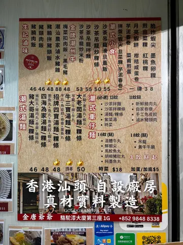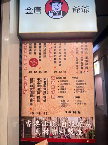观塘午市$40蚊都可以食得饱!?金唐爷爷最近在美食重地骆驼漆大厦新开张,主打潮汕牛肉及特色食品,全部饭面都$50蚊内,绝对值得一试!! ✌️- 潮式车仔面 (自选): 🍜可选不同面底及配料,配料HK$8起就食到新鲜材料非常抵食!!沙茶拌面 HK$8 🍜可选粗面幼面,选用弹牙爽口蛋面,再拌上香浓沙茶酱。自家卷章 HK$9 🐷潮汕特色食品,香脆腐皮包住猪肉滑煎香,非常惹味。温体牛丸 HK$13 🐂牛味浓郁鲜牛丸,必试!!吊龙 HK$16 🥩牛背位,肉质嫩滑又充满牛肉鲜香!!- 墨鱼卵粿 HK$38 🦑必试潮汕美食!!将墨鱼卵打胶制成。煎香后口感烟韧充满墨鱼鲜香!!配上开胃辣椒酱超惹味!!- 沙茶吊龙滑蛋盖饭 HK$42 🥩🥚🍚潮式车仔面 (自选): 🍜- 沙茶拌粿条 HK$8 🍜- 马鲛鱼丸 HK$9 🐟- 鲜虾尖 HK$13 🦐- 黄牛牛腩 HK$16 🥩