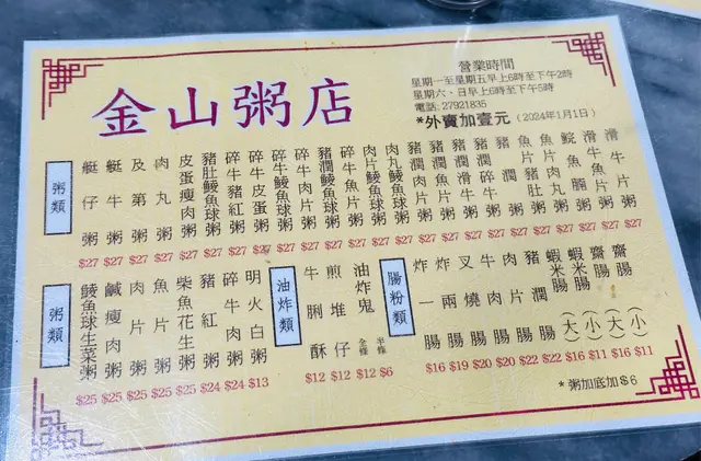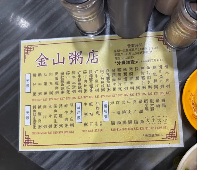 西貢必食粥店 Dorcas_Ng等级22025-05-011K 浏览 关注 五一假期留港消費,一於入西貢搵食,「金山粥店」係粥品首選。平日佢只開到2pm,假日就會做到5pm。今日黎到堂坐已滿要等一等👌🏼同老闆打招呼,佢認得我,4年前開始黎幫襯,算係熟口熟面~~🥬🦐🐟🐖🐄🦪🫚🥜🥬~~生滾粥$27你可以自選雙拼,我要了「豬潤魚腩粥」,唔使睇餐牌啦!冇寫架!佢有嘅都可以做俾你架呢啲咪人情味囉粥底真係好靚正店埋邊有個6呎高的大粥煲,係傳統有歷史的粥煲。^V^🥢🍵🥢🥣🥢🧂🥢 ^V^金山 每日新鮮自家製的油炸鬼,蔥花炸両腸$19即叫即製 係好多人叫的。我係健康之選「蔥花蝦米腸」細$11走油少色😬老闆都會跟order做俾你好窩心啊!埋單$38食飽飽好滿足喔…查看更多+ 2以上食记乃用户个人意见 , 并不代表OpenRice之观点。赞好分享西貢必食粥店 金山粥店 https://s.openrice.com/QrLT0fUPR00检举 张贴 评分5味道3环境4服务4卫生5抵食推介美食餐牌 生滾粥與腸粉 都係平靚正👍🏼蔥花炸兩腸 $19 堂食與外賣都係熱選蔥花蝦米腸 細 $11 我要求走油小色 健康之選豬潤魚腩粥 $27豬潤新鮮爽蝦米腸炸兩腸雙拼粥用餐途径堂食