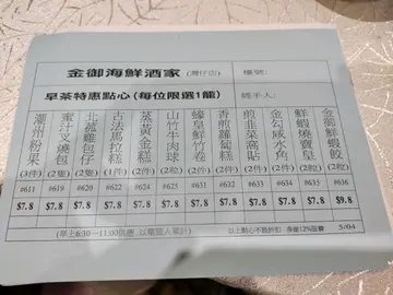 上星期四晚到了湾仔金御海鲜酒家,因为之前经过见到有特价食品、而且好耐冇到过,即管去试一试,虽然这间饭店服务费是+12%。去到看到有1/5塲给包下,walk in 客约有10枱客,已经好耐没见到这酒家平时有这么多客晚饭,但待应只得两个,所以她们都比较忙,又要下单、又要分𩠌。讲到食物,味道尚算不错,价钱亦可以,份量足够,我们俩人只吃两个𩠌便足够,还有甜品(红豆沙)送,虽然略甜和结,但可接受,整体而言,价格和食物味道、款式都算合理。…查看更多