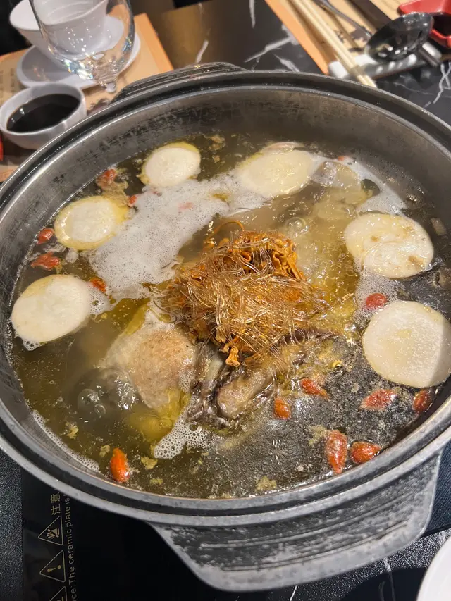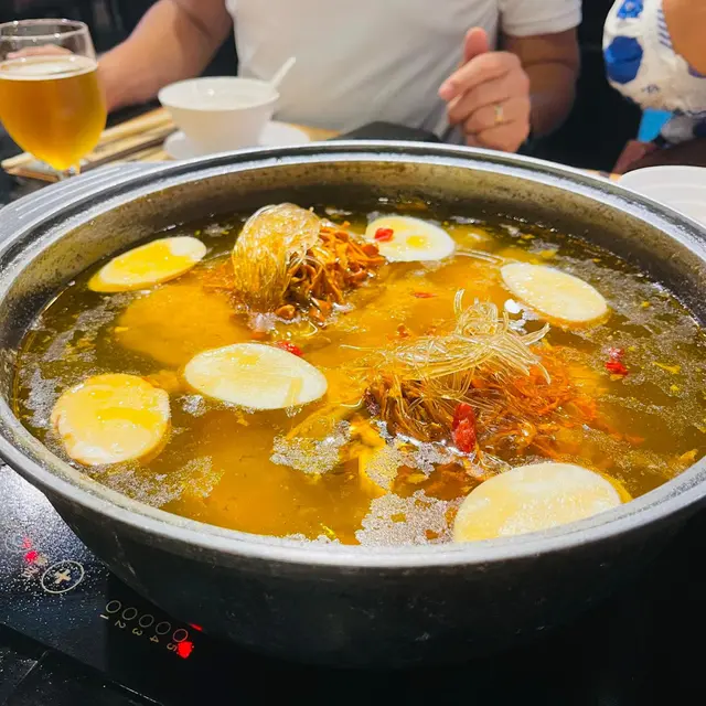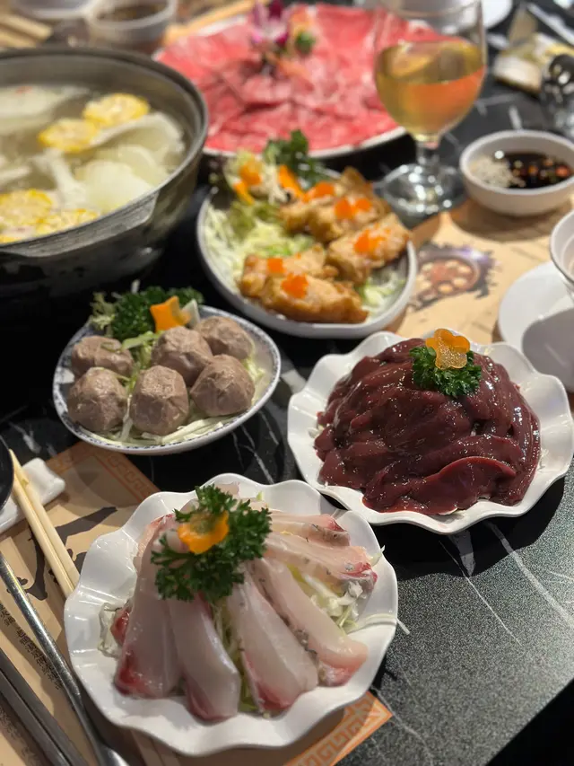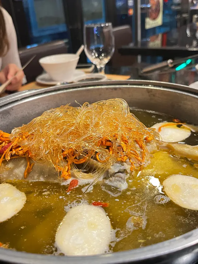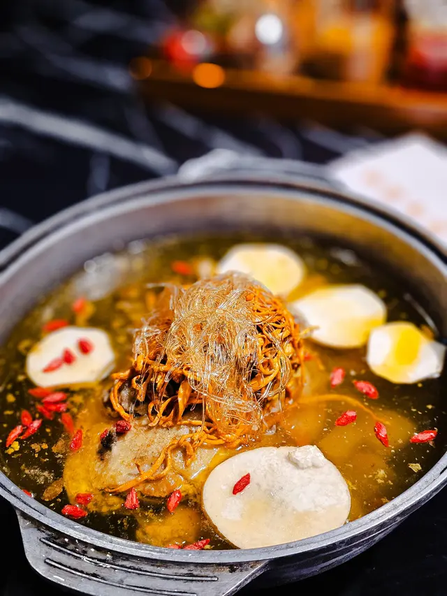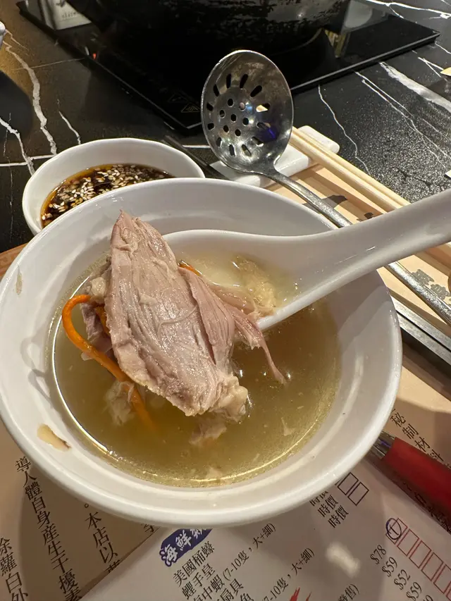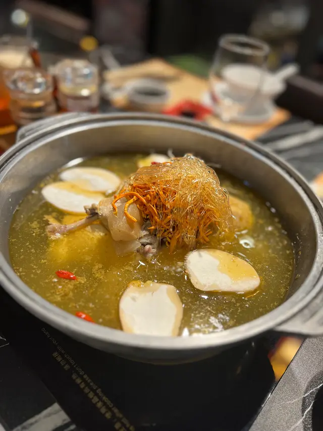 😋一到冬天就手腳冰冷,最啱食養生火鍋補一補!🔥金撈富貴老鴨湯係呢間餐廳嘅招牌菜,老火湯底濃郁甘香,鴨肉燉得很鬆軟,加埋蟲草花、枸杞、素翅大量材料,打邊爐前飲一碗,十分暖心滋補!🐟石蚌活魚刺身,薄薄一片晶瑩剔透,非常爽口鮮味,魚油香味係口中散發!👍🏻火鍋食材都好新鮮,安格斯牛頸脊軟嫩好食,岩手縣白金豚肉係必點之選,肉質細嫩無渣,富肉香而不羶!🧡第一次食咁巨型既竹笙王,吸滿湯汁後酸甜爽脆;鵝腸頭都唔錯,爽口唔肥膩!金羅漢果雪梨茶清熱下火,自家製所以唔會太甜,同樣好推介!✨金撈富貴老鴨湯 ($238)✨活魚刺身($480)✨安格斯牛頸脊($238)✨岩手縣白金豚肉 ($169)✨乾竹笙($89)✨鵝腸頭 ($98)✨皇帝菜 ($52)✨金羅漢果雪梨茶($59)…查看更多