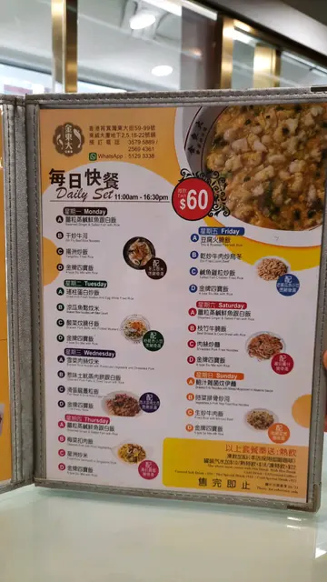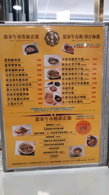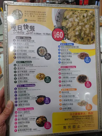Shau Kei Wan on weekends is very busy with a lot of hikers and people heading to the beach who also decide to stop here for a bite to eat. Usually they choose the two famous beef brisket noodle places. But the other restaurants? Often over looked.We decided to try one that is not on the radar. Kam Tung Kitchen is a Chinese restaurant serving a lot of dishes often found in nicer Chinese restaurants. Things like abalone and that type of thing. But at lunch they have a lunch menu.The menu changes daily. Menu is in English and Chinese and comes with a drink. Cost? $60 and there is no 10% service charge.We shared two dishes. This is the Rice Served in Shrimp and Chicken Soup. The soup was had a rich umami taste. Lots of fresh shrimp were found along with some tofu puffs that soaked up the soup flavour. Claypot Fried Rice with Shrimp and Shrimp Paste was hot and bubbling. The rice wasn't oily and it had some shrimp taste but it wasn't too salty. It smelled fantastic as well.A decent price with good portions. It was enough to share between the two of us. Service is fast and it seemed this place had more of the residents in this area dining.…查看更多