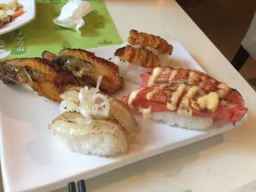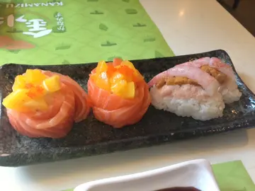 都有三年无黎过食喇,我以前觉得佢啲寿司OK都几好食架㖞,点解而家变差哂架?三文鱼香芒花之恋,叫做无乜野啦。极上寿司,三层:甜虾、海胆,蟹肉,不新鲜又无味。甜虾海胆卷,同极上寿司一样啦,系我以为佢好食,点知原来叫错野。火灸鳗鱼、蟹棒、海胆,鱼背,鳗鱼同埋蟹棒就普通,海胆同鱼背就几难食。我谂最OK就系牛利同鸡亦啦,食落去唔难食啰。