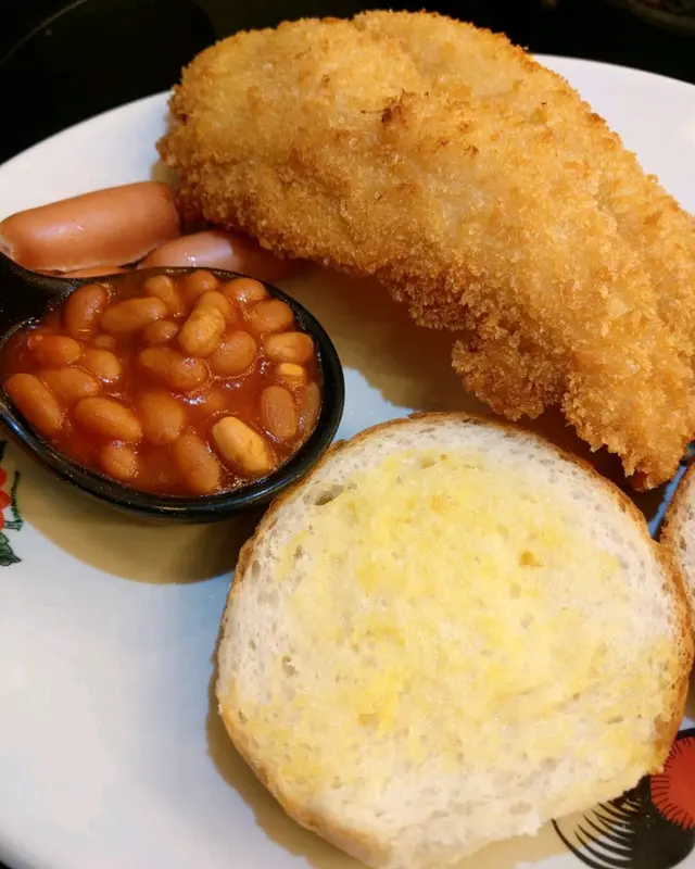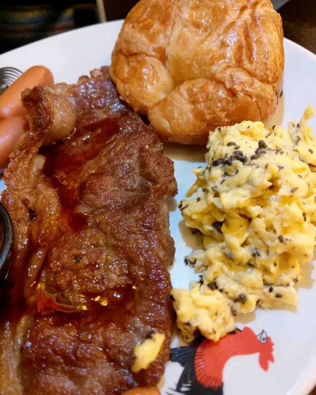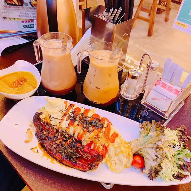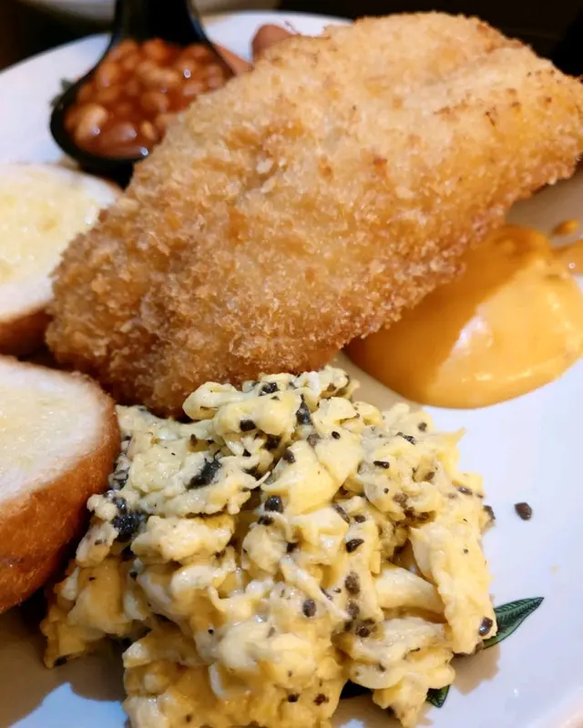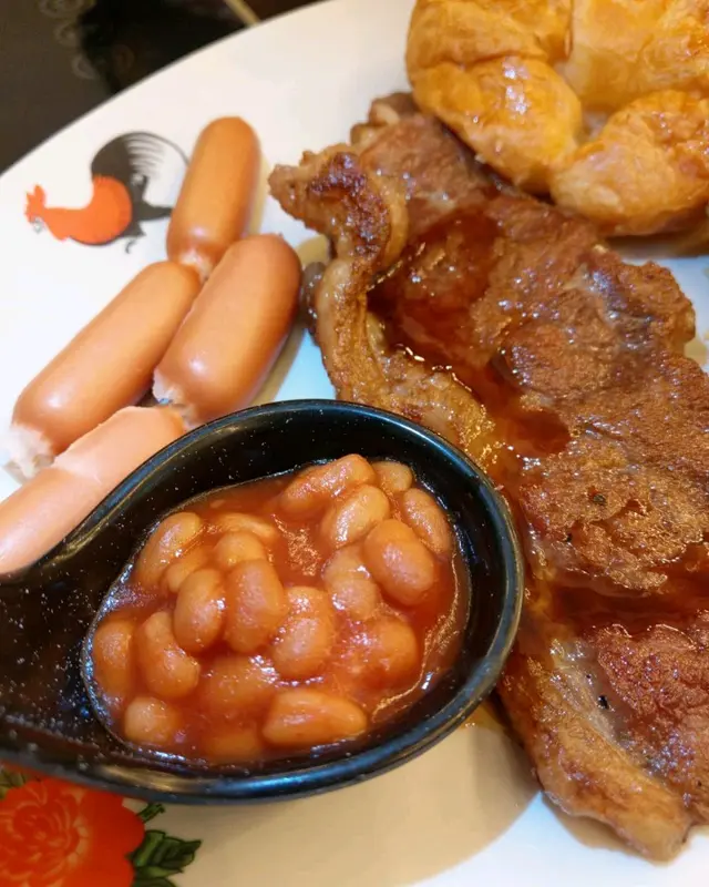 前排係太子返工前,見到間充滿特色既餐廳♥門面係充滿6-70年代感,俾個門口吸引左,所以就入去食左個快早餐😗入面有五光十色嘅霓虹燈,仲有放咗好古舊嘅街燈, 鐵閘 ,成個feel 好似去左TBB既古裝街咁😚 卡位嘅設計就好似板間房嘅門框,真係好特別!🔸吉列魚柳黑松露炒蛋脆皮腸奶油豬茄汁豆 $48 俾條魚柳嚇親🐟,超大條,有成個男士手掌咁長,炸得又香脆,入口冇雪味,掂!黑松露炒蛋好香,黑松露方面落得好足料🍳奶油豬都烘得香脆,上面既煉奶份量都剛剛好,食起上嚟唔會話太甜👍所有早餐都可以再加錢加多碗粉 +$8 有細榨菜稻庭烏冬🔸牛扒黑松露炒蛋脆皮腸牛角酥茄汁豆 $42牛扒冇得揀幾成熟,但廚師會幫你控制好一個岩食既口感,上碟後食牛味出既,肉質嫩口,塊扒都大塊,唔古寒,以哩個價錢泥試,CP值好高,at least 包你食得飽!🔸冰鎮奶茶 (跟餐+$5)茶味爭左啲啲,但杯野勝在夠凍❄️過下口痕都ok🥰查看更多