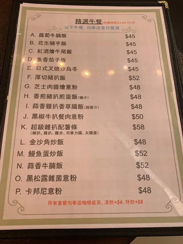 為食小妹終於出嚟覓食啦~~小妹介紹得嘅,又係自己去過唔止一次嘅地方話說,大雨滂沱,小妹飢寒交迫,入到冰室,隨即望餐牌,店員姐姐問我加唔加$10加湯同飲品,我諗到無諗就加咗,因為之前飲過呢度嘅羅宋湯,都唔錯,飲咗唔會有口渴感,今次就試佢哋嘅洋蔥湯,上湯嘅時候,小妹莫明感動,因為,碗湯滾熱辣㗎有幾多西餐廳都未必做到,讚之後,小妹食嘅帶子意粉,同樣係即煮即上,令到小妹嘅食指大動,就算係節食嘅諗法都拋諸咗腦後不過呢個份量就比較啱女生,男生可能唔夠食啦而煙三文魚沙律,個沙律落嘅醋同橄欖油剛剛好只係特色就唔係太突出,但擺碟都美觀嘅最後,小妹點咗杯熱杏霜,唔洗喺$10以外再額外加錢,仲大大杯熱辣辣,滿足附加咗一張之前喺午餐時間食嘅肉醬意粉圖,嗰次純粹偶遇,但係好欣賞佢,因為我未試過喺冰室會用心以兩種芝士放面焗㗎~~連小妹平時唔多食肉醬意粉,都食唔停呀,誠意推介俾各位用心去煮,食客係食得出㗎~~加油💪🏻💪🏻P.S. : 五月份無論午餐定晚餐,均有九折 (資料來源:收銀哥哥,可能係老闆)查看更多