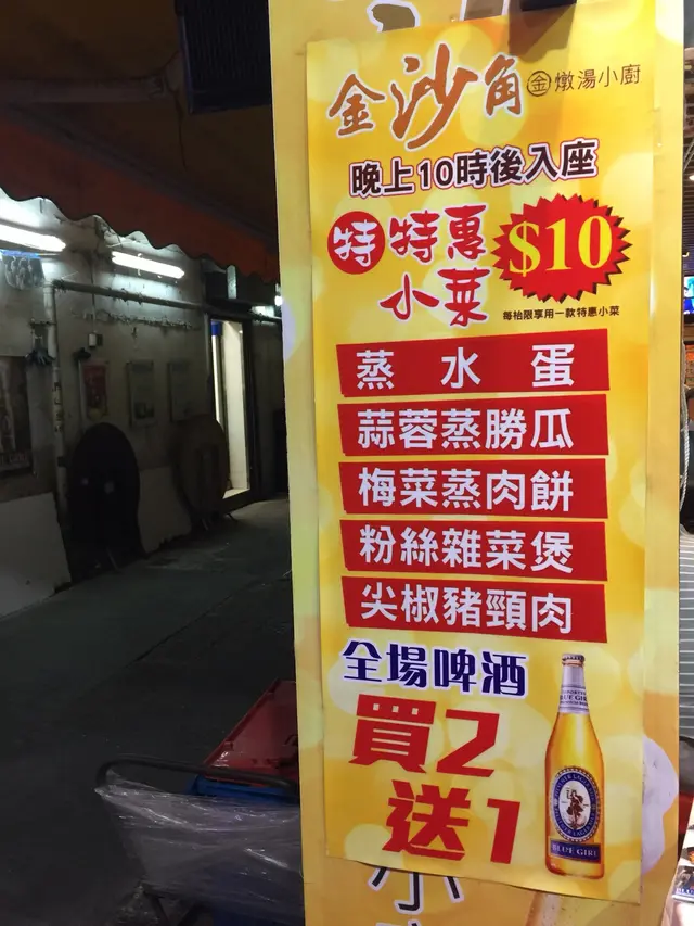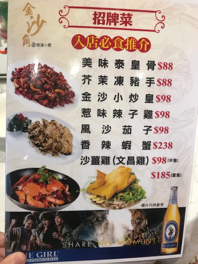金沙角?在元朗居然有金沙角,我呢個沙田人幫襯咗金沙角超過20年,呢間就梗係要會一會佢,希望搵得番嗰種味道。佢哋真係小廚素質,並沒有大排擋嘅鑊氣,要有鑊氣煩請稍移玉步到後街就能解決鑊氣呢個問題。今日叫咗燉湯一盅,幾好味有好似無味精,唔錯。燒乳鴿就比較普通,皮唔脆,肉亦鞋。椒絲腐乳通菜,太濕啦,就好似湯浸咁。椒鹽鮮魷拼鴨舌,鮮魷正常而鴨舌炸過頭偏硬。另外再加多支啤酒,全單360(人均180)就因為「金沙角」呢個招牌入去幫襯,而若果用喺沙角金沙角嘅水準來説,真係不值一提。…查看更多