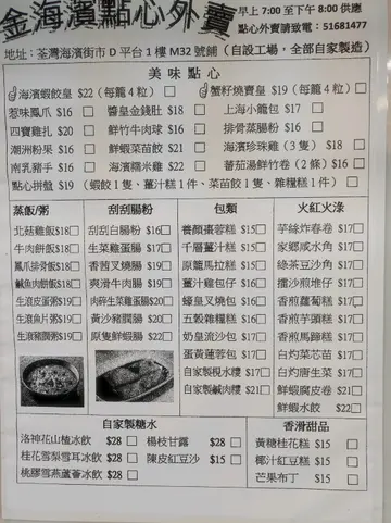 金海濱點心 (荃湾) 网址: https://s.openrice.com/QrLS0giaA00 地址: 香港荃灣怡康街1-7號海濱花園D平台街市1樓M32號舖 电话: +852 56479539