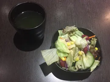 下昼闷闷地,食下新野!呢间系楼上铺,见到楼下有餐牌,日本定食多,刺身、熟食、锅类都有!而我今次已经系第n次黎,都系食厨师推介'蒜片牛肉粒定食'👍前菜:味噌汤+芝麻酱红豆沙律,主菜牛肉粒唔靭 、蒜片炸得好味、份量刚刚好,仲有野饮!
