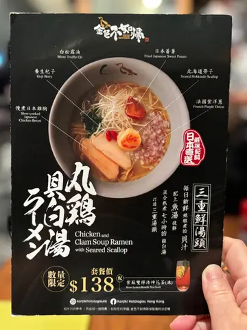 平时好少会去中环,难得过开嚟呢头,又系揾食嘅时间,我知道中环有好几间唔错嘅拉面店,作为拉面控嘅我,点都要去试下。今次就去位于IFC嘅《金色不如帰》,呢间店响社交媒体上都不时见到有人介绍,终于比我记得佢,可以一试东京米芝莲一星级嘅拉面。我点咗佢主打嘅《贝汁酱油拉面》,店内有介绍呢个汤底系由蚬汤、猪骨清汤同鱼清汤肴制而成,汤底嘅颜色好清彻,味道系好鲜甜,冇果种腥臭味,唔知系咪加咗猪骨清汤,再捞埋牛肝菌粉、牛肝菌油同黑松露酱捞埋一齐而中和咗个味道。佢个汤底味道系好独特,清得嚟又够浓郁,但唔算系我好钟意嘅味道,加上佢捞好多唔同嘅调味料,令到个味道百感交杂。可能自己思想未进化,仲系偏向传统嘅猪骨或者鸡白汤会比较啱自己嘅胃口。面质方面有咬口同弹性,系我想要嘅口感;三层肉同低温叉烧味道唔错,肉质嫩滑够淋,有猪肉嘅香味,只系两块肉冇图片影出嚟咁大块。价钱方面当然系IFC价,入得嚟食都预咗要付出一定嘅价钱,虽然比一般嘅拉面贵,但我觉得系值得一试米芝莲一星级嘅味道。…查看更多