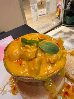 用左原个椰青熬煮出黎既黄咖喱鸡肉滑嫩, 最惊喜系个椰肉, 开头咬落去以为系洋葱, 点知原来系椰肉, 好清甜咖喱香浓幼滑带小小微辣香法包外脆内软, 咬落去嗦嗦声浸落去咖哩度一齐食, 最后不经意就食哂成个法包最后叫埋龙眼冰同青柠梳打透心凉之选…查看更多