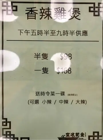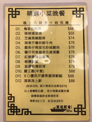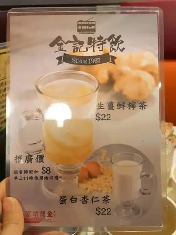 情谊心中印系列(2)茶餐厅, 是香港饮食文化的特色之一, 所以不少游客都必定到茶餐厅品尝香港的地道食物, 而我这位从外地回来的朋友, 也不能例外.老实说, 香港的茶餐厅的确甚多, 但要找些有主题的, 就少之又少. 这夜就带友人逛逛北角, 然后就到了以怀旧电影院为主题的金记冰室, 吃顿简单的晚餐.一向钟情于姜味的饮品, 于是就拣了杯热生姜鲜柠茶($8). 咦? 竟然有惊喜, 姜味超浓郁的, 又有柠檬的清新作中和, 杯内还有不少姜丝, 全都给我吃清光了.南乳粗斋煲($68)以砂煲载著, 保持住热腾腾的状态. 它的内容丰富, 有茄子, 支竹, 菜心, 西生菜, 西兰花, 粉丝, 菇类等, 南乳味道不会过份的浓烈, 咸度适中. 友人从未吃过南乳的菜式, 也赞赏这斋煲可口美味, 不自觉地吃多了蔬菜.原以为这碟滑蛋叉烧饭($53)会是滑蛋和叉烧一并铺在白饭上, 实际上, 却是分开上的. 叉烧蛮多, 更是带点肥肉哦, 滑蛋也超多, 但我不大喜欢太多汁浸著这些滑蛋和叉烧吧, 感到失去了滑蛋的质感.一边听著收音机的广播, 一边笑著吃著, 虽然我们吃的并不是山珍海味, 但已够满足了. 好友相聚, 就是如此这般简单吧. …查看更多