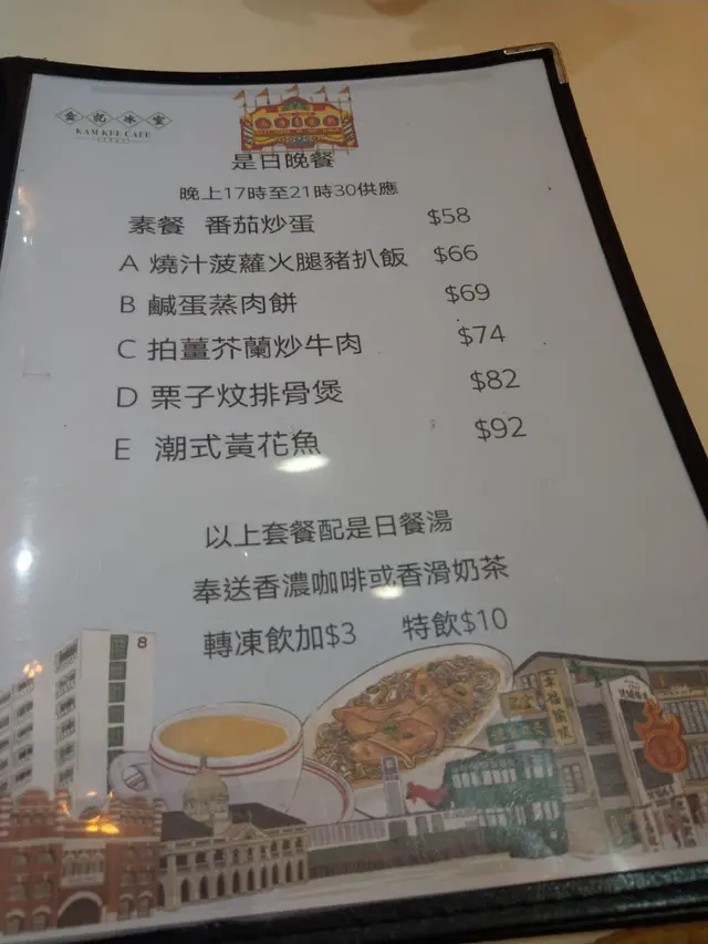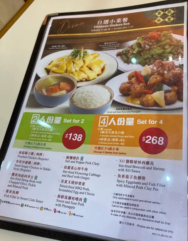 套餐今日餐湯是中式老火湯, 湯夠熱, 足料有青紅蘿蔔, 豬骨, 清甜. 主菜送來了, 勁熱.... 鐡板美式什扒意粉蒜蓉汁, 好豐富, 有薄牛扒, 雞扒, 豬扒, 煙肉. 配有西蘭花, 車厘茄, 傳統鐵板好保溫. 意粉分開送上.蒜蓉汁, 慢慢淋, 聞到香氣加惹味.腸仔好味. 煙肉吾太肥. 薄牛扒, 煎得香, 肉質稔.豬扒也不錯, 弟弟吃到不停口.鐡板香煎雞扒拼吉列魚柳薯菜燒汁, 吉列魚柳, 好大塊, 又炸得鬆脆, 我最愛.香煎 雞扒好滑, 又無骨. 配粗炸薯條, 脆口又熱辣辣, 點些茄汁, 弟弟要分享 . 餐茶: 叫了熱檸檬茶, 熱檸檬水, 因為食得好飽, 要用檸檬茶幫助消濟了. 哈哈 !!金記食物好味, 豐富抵食, 免加一小費.侍應有禮. 聖誕節期間可以食西餐又吾會加價, 真好 !! 要再來. …查看更多