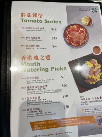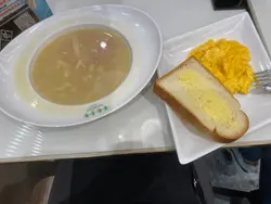 仿鲍片及火腿丝通粉是用鸡汤煮的,汤特别甜,通粉软硬适中。面包吐司搽了牛油,也烘焙得脆脆的,蛋是幼滑的牛乳炒蛋,加上吐司上面食,味道方面唔错。饮品方面是热牛奶,热了的牛奶给我一种暖心既感觉。