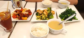 。Order咗二人套餐, 三𩠌,两汤,两饮品,两白饭, 都系$155. 楼面戴眼镜的年轻侍应也很有礼貌。 咕噜肉不是用罐头菠萝 。xo酱虾球炒西兰花有6只新鲜虾。 汤没有味精。 真系唔差, 上网睇到原来好多分店已结业, 希望皇室堡呢间唔会啦!