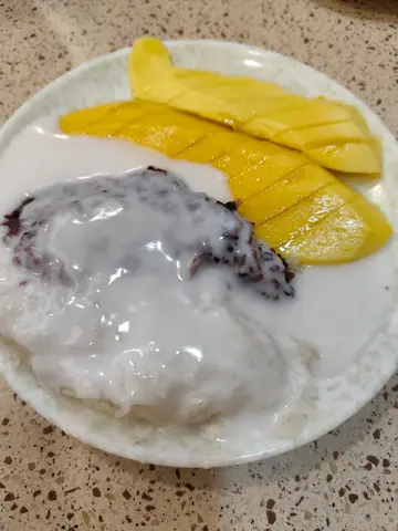 ,而且别小看它,足够3-4人享用。最后,当然来一道美味甜品吧,套餐就包了「芒果糯米饭」(套餐),除了带有软糯的白糯米,还加上烟韧的黑糯米,饭粒微热,拌上香甜椰浆,这样已很好吃,伴以清甜芒果肉,美味度提升几级